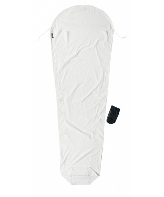 bílá přikrývka 340g z bavlny tvaru mumie vhodná jako cestovní spací pytel do teplých krajin nebo hygienická pokrývka a přidávající 2,9°C k teplotnímu komfortu spacího pytleVíce