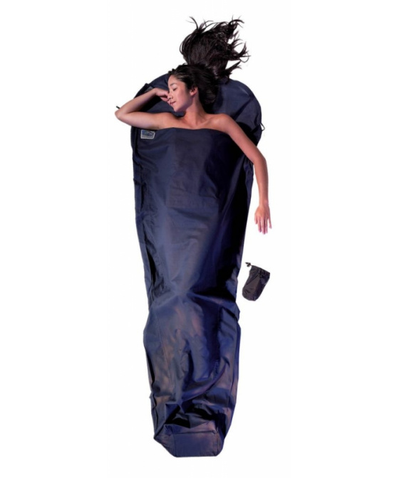 tmavomodrá přikrývka 210g z egyptské bavlny tvaru mumie vhodná jako cestovní spací pytel do teplých krajin nebo hygienická pokrývka a přidávající 3,9°C k teplotnímu komfortu spacího pytleVíce