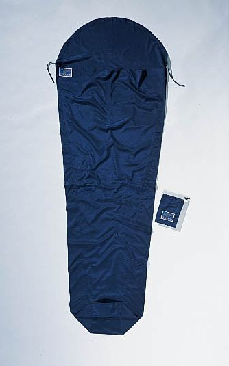 tmavomodrá přikrývka 180g z hedvábné bavlny tvaru mumie vhodná jako cestovní spací pytel do teplých krajin nebo hygienická pokrývka a přidávající 4,8°C k teplotnímu komfortu spacího pytleVíce
