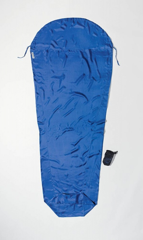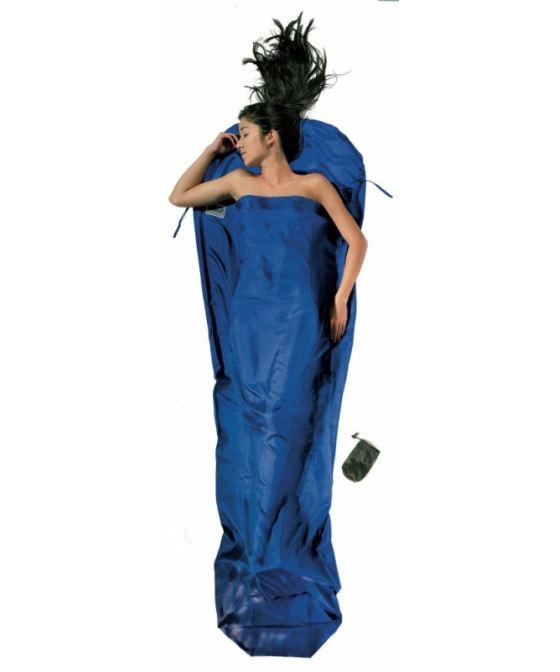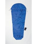 modrá přikrývka 135g z hedvábí tvaru mumie vhodná jako cestovní spací pytel do teplých krajin nebo hygienická pokrývka a přidávající 5,3°C k teplotnímu komfortu spacího pytleVíce