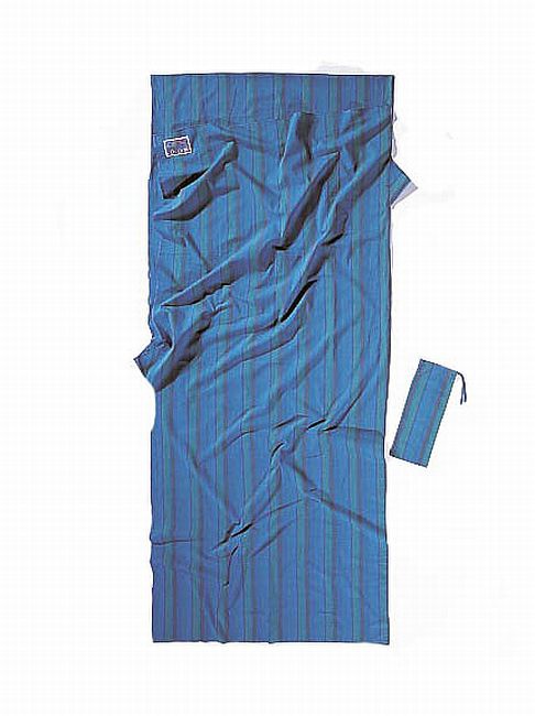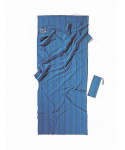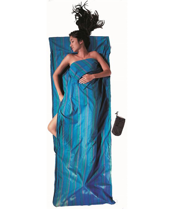 modře pruhovaná přikrývka 410g z bavlny obdelníkového tvaru vhodná jako cestovní spací pytel do teplých krajin nebo hygienická pokrývka a přidávající 2,9°C k teplotnímu komfortu spacího pytleVíce