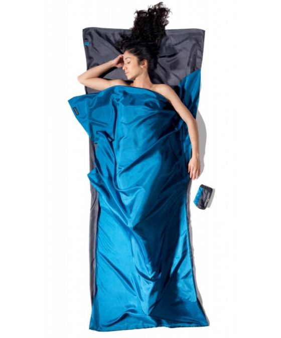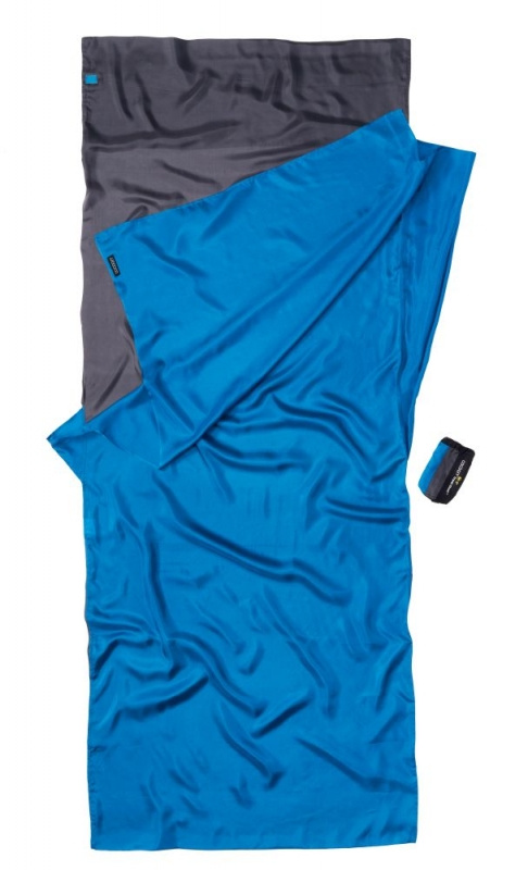 modrá a šedá přikrývka 160g z hedvábí obdélníkového tvaru vhodná jako cestovní spací pytel do teplých krajin nebo hygienická pokrývka a přidávající 5,3°C k teplotnímu komfortu spacího pytleVíce
