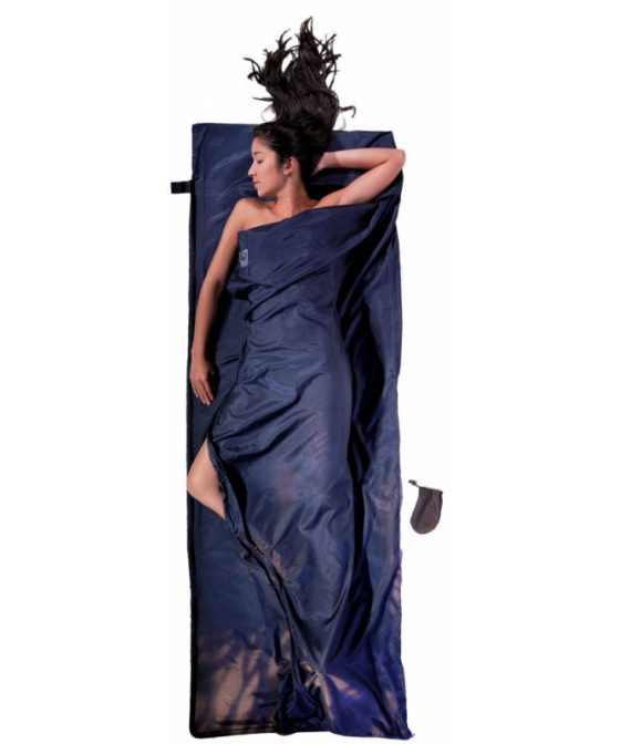 tmavomodrá přikrývka 160g z hedvábí obdélníkového tvaru vhodná jako cestovní spací pytel do teplých krajin nebo hygienická pokrývka a přidávající 5,3°C k teplotnímu komfortu spacího pytleVíce