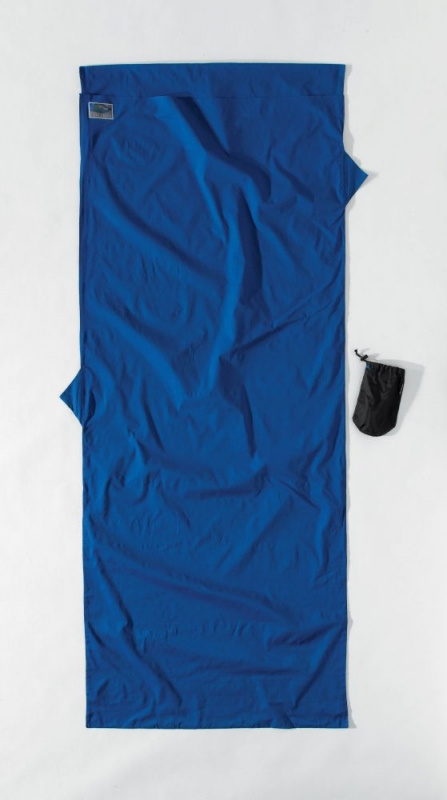 modrá přikrývka 410g z bavlny obdélníkového tvaru vhodná jako cestovní spací pytel do teplých krajin nebo hygienická pokrývka a přidávající 2,9°C k teplotnímu komfortu spacího pytleVíce