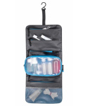tenká a lehká šedomodrá toaletní taška 172g s odnímatelným transparetním pouzdrem na zip pro přepravu drobností a tekutin s uzavíráním pomocí plastového závěsného háčku a čtyřmi vnitřními kapsami s voděodolnými zipy YKK Aqua Guard®Více
