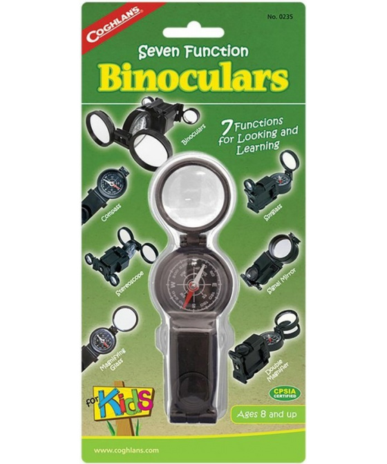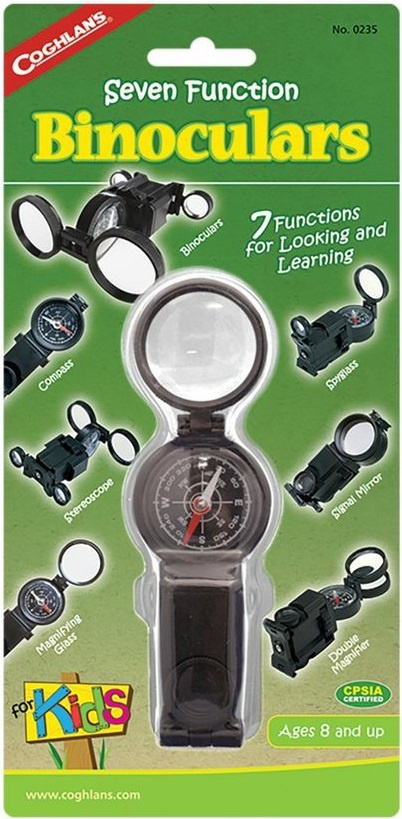 dětský dalekohled se sedmi samostatnými funkcemi pro dětské hry a učení binokulární dalekohled monokulární dalekohled stereoskop, díky kterému se prohlížený předmět jeví jako plastický kompas pro rychlou orientaci se stupnicí dělenou po 10 stupních jednoduchá lupa o průměru 30 mm dvojitá lupa o průměru 30 mm pro dosažení většího zvětšení signální zrcátko o průměru 30 mm určeno pro děti od 8 letVíce