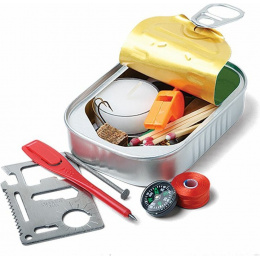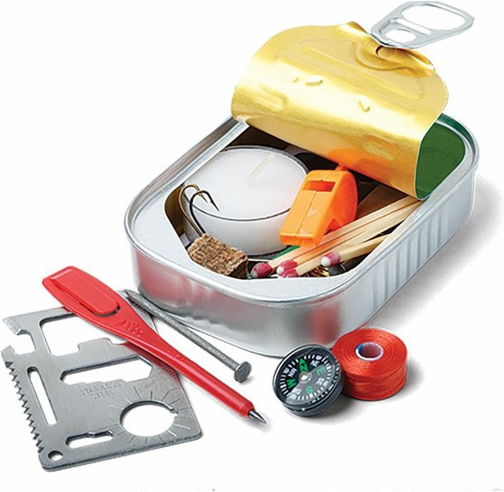 krabička poslední záchrany v kompaktním, lehkém a vodotěsném provedení v podobě konzervy balíček obsahuje 32 předmětů, které mohou pomoci v situacích ohrožení života z výroby uzavřená konzerva zajišťuje použitelnost a úplnost seznamu obsahu po otevření může být konzerva použita jako šálek, nádoba na vaření nebo konvice obsah: multifunkční nářaďová karta jehla na šití signální píšťalka návod (první pomoc/jak přežít) v anglickém jazyce tužka papír na poznámky reflexní šňůrka 90 cm kompas 2 podpalovací kostky multifunkční provázek 3 m drátek 91 cm 4 voděodolné zápalky vlasec/nit na šití 31 m krabička zápalek 3 stahovací pásky lepící páska 30 cm uzavíratelný sáček 2 hřebíky 2 spínací špendlíky 2 háčky na ryby žiletka čajová svíčka