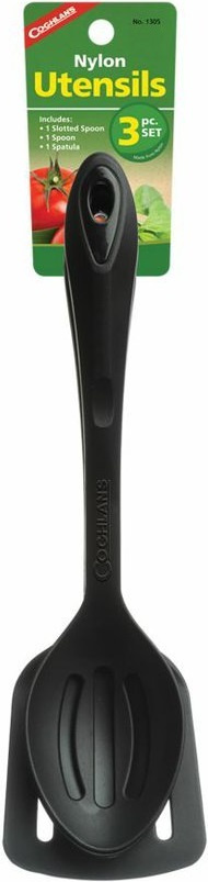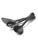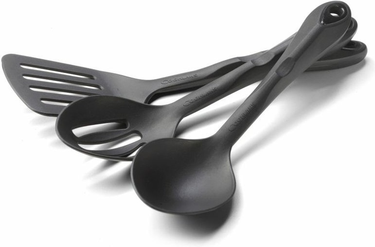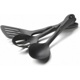 třídílná kuchyňská sada pro servírování oblíbených jídel během outdoorových aktivit sada obsahuje lžíci, lžíci s otvory a obracečku vyrobeno z odolného černého nylonu DuPont 101, který odolává teplotám do 210°C materiál je lehký a odolný proti poškrábání nádobí je možné mít v myčce