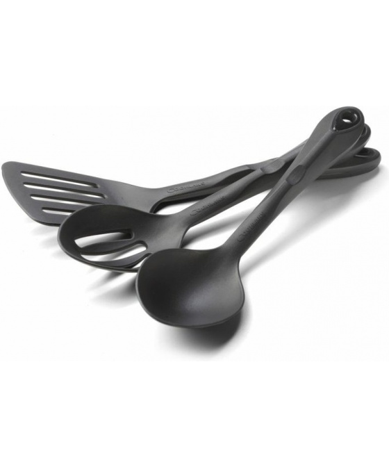třídílná kuchyňská sada pro servírování oblíbených jídel během outdoorových aktivit sada obsahuje lžíci, lžíci s otvory a obracečku vyrobeno z odolného černého nylonu DuPont 101, který odolává teplotám do 210°C materiál je lehký a odolný proti poškrábání nádobí je možné mít v myčceVíce