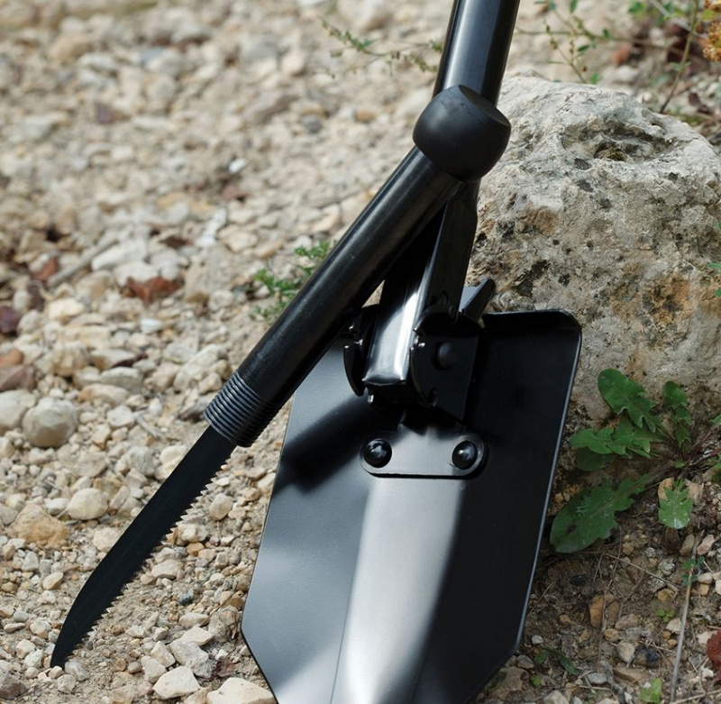 skládací lopata z oceli 950g se šroubovací výsuvnou rukojetí, zajišťovací západkou pro použití ve třech polohách a pilkou 14cm uschovanou v rukojeti lopatyVíce