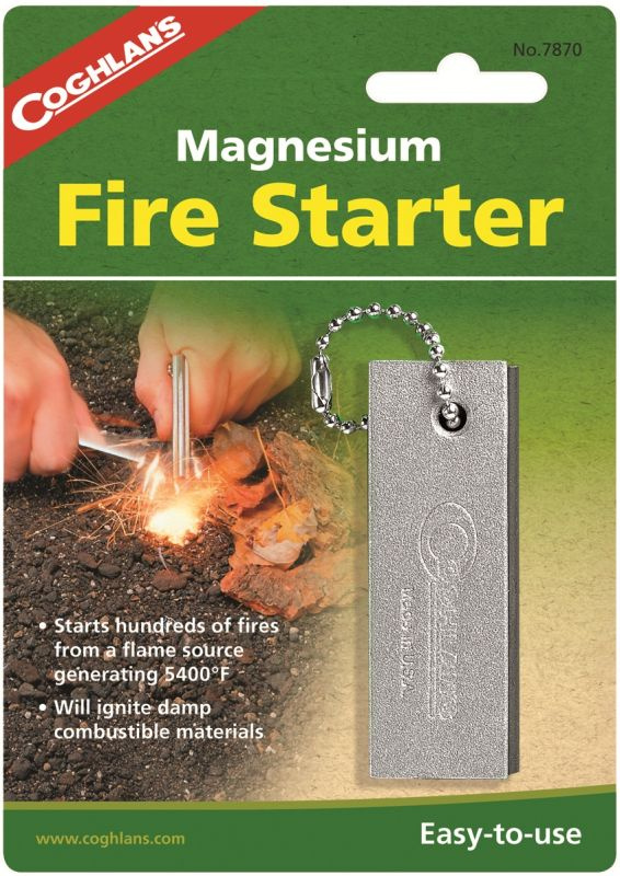 -pomocí přiložené ocílky, vrchní hrany nože či jiného vhodného kovového předmětu se naškrábejte drobné magnéziové piliny z bloku na vhodný troud, jako je suché jehličí, listí nebo suchá tráva