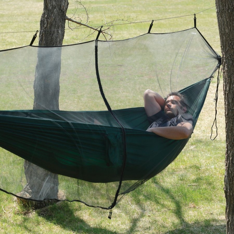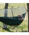 -šedá moskytiéra vhodná pro většinu typů hamak navržená pro klidný spánek bez přítomnosti obtížného hmyzu -díky polyesterové síťovině o hustotě 20 otvorů na 1 cm2 účinně brání průniku hmyzu včetně komárů -uzavírání pomocí obousměrného zipu -součástí je závěsné lano o délce 7 metrů -elastické popruhy v horní části moskytiéry s plastovými karabinami pro upevnění k závěsnému lanu -stahovací šňůrky na koncích moskytiéry pro zabezpečení před hmyzem po nasazení na hamaku -integrovaný úložný obal se stahovací šňůrkou -moskytiéra není impregnovaná