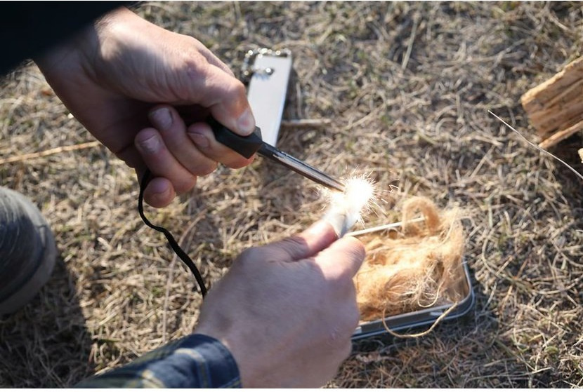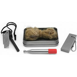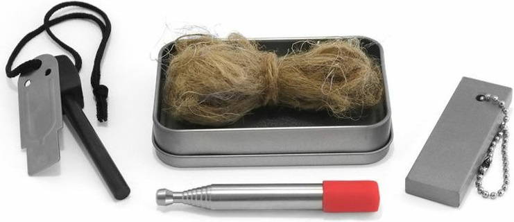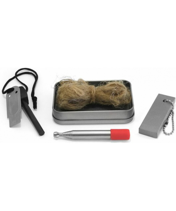podpalovací sada v uzavíratelném plechovém boxu pro efektivní zažehnutí ohně téměř za každého počasí obsahující šest předmětů ocílka pro naškrábání hoblin z magnézia a vykřesání jisker přejížděním po podpalovací tyčince přírodní jutová vlákna, která slouží jako skvělý troud a snadno se podpalují vykřesanými jiskrami plechový box k uložení celé sady, nebo sloužící jako závětří při zapalování troudu, pokud je pro založení ohně příliš větrno podpalovací tyčinka, díky které dochází k vytvoření jisker pro zažehnutí hoblin z magnézia a vzplanutí troudu teleskopická tyč pro rozfoukání ohně dosahující délky 50 cm se silikonovým náústkem, do kterého foukáte vzduch směrem do ohně pro efektivnější rozžehnutí magnéziový blok pro naškrábání magnéziových hoblin, které vzplanou bílými plameny o vysoké teplotě pro podpálení paliv a trouduVíce