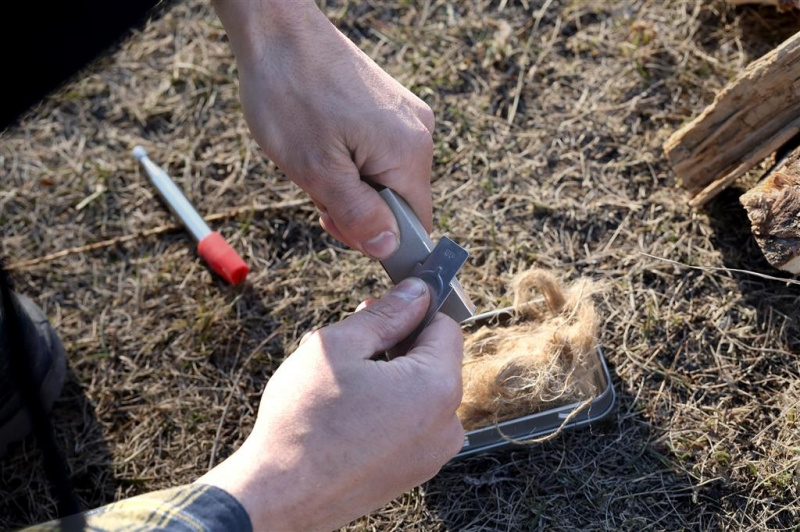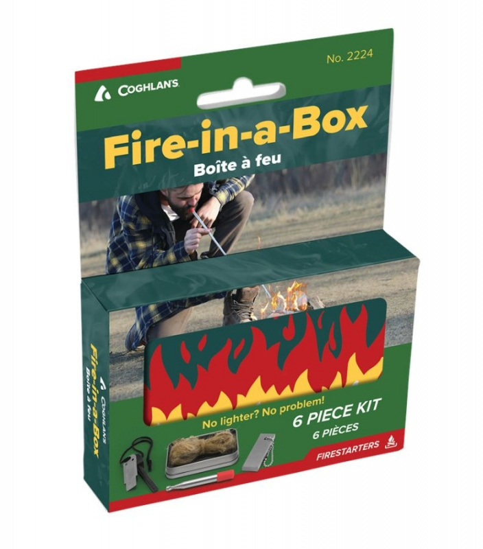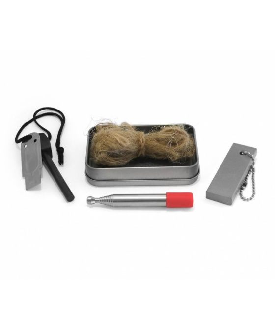 -podpalovací sada v uzavíratelném plechovém boxu pro efektivní zažehnutí ohně téměř za každého počasí obsahující šest předmětů -ocílka pro naškrábání hoblin z magnézia a vykřesání jisker přejížděním po podpalovací tyčince -přírodní jutová vlákna, která slouží jako skvělý troud a snadno se podpalují vykřesanými jiskrami -plechový box k uložení celé sady, nebo sloužící jako závětří při zapalování troudu, pokud je pro založení ohně příliš větrno -podpalovací tyčinka, díky které dochází k vytvoření jisker pro zažehnutí hoblin z magnézia a vzplanutí troudu -teleskopická tyč pro rozfoukání ohně dosahující délky 50 cm se silikonovým náústkem, do kterého foukáte vzduch směrem do ohně pro efektivnější rozžehnutí -magnéziový blok pro naškrábání magnéziových hoblin, které vzplanou bílými plameny o vysoké teplotě pro podpálení paliv a troudu