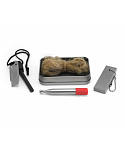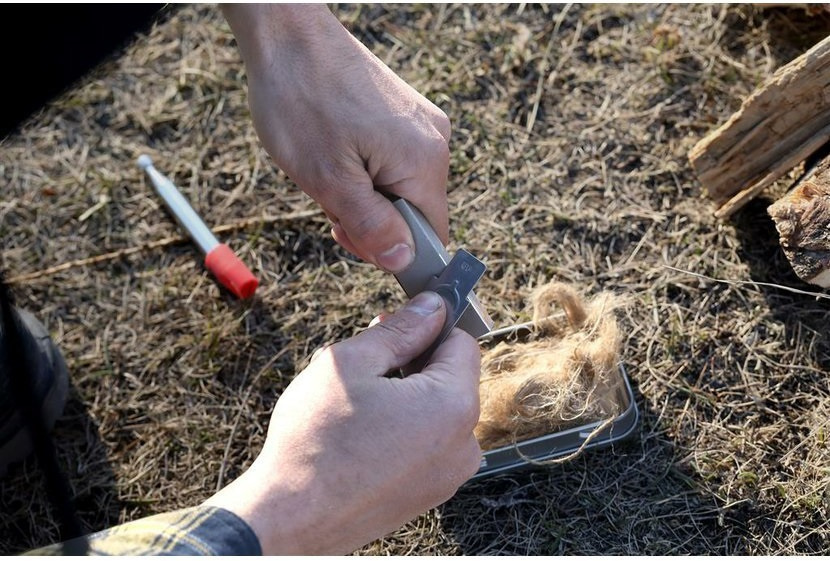 podpalovací sada v uzavíratelném plechovém boxu pro efektivní zažehnutí ohně téměř za každého počasí obsahující šest předmětů ocílka pro naškrábání hoblin z magnézia a vykřesání jisker přejížděním po podpalovací tyčince přírodní jutová vlákna, která slouží jako skvělý troud a snadno se podpalují vykřesanými jiskrami plechový box k uložení celé sady, nebo sloužící jako závětří při zapalování troudu, pokud je pro založení ohně příliš větrno podpalovací tyčinka, díky které dochází k vytvoření jisker pro zažehnutí hoblin z magnézia a vzplanutí troudu teleskopická tyč pro rozfoukání ohně dosahující délky 50 cm se silikonovým náústkem, do kterého foukáte vzduch směrem do ohně pro efektivnější rozžehnutí magnéziový blok pro naškrábání magnéziových hoblin, které vzplanou bílými plameny o vysoké teplotě pro podpálení paliv a troudu