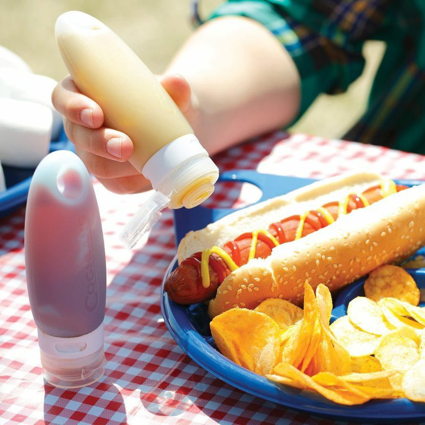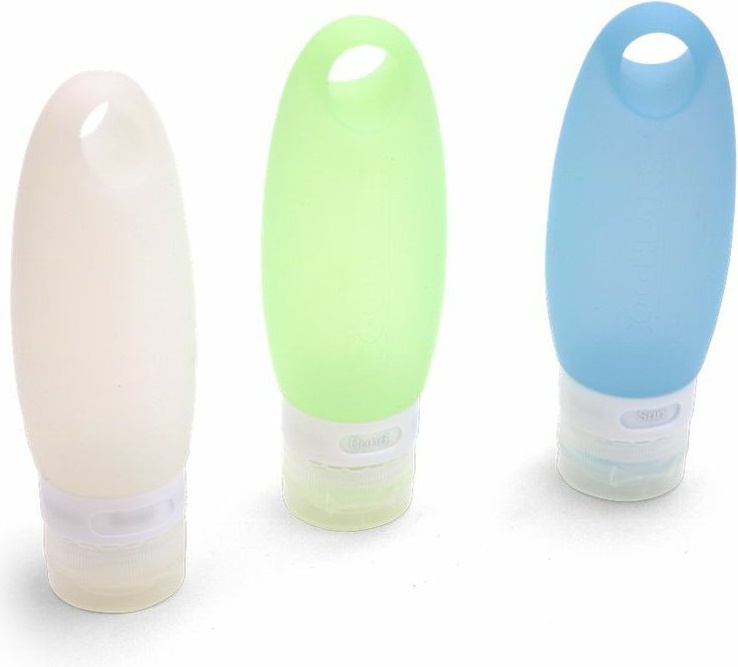 třídílná sada měkkých silikonových lahviček o objemu 89 ml různá barevná provedení pro lepší identifikaci obsahu ideální pro převážení kosmetických přípravků, tekutin a gelů, nebo během kempování pro uskladnění ochucovadel šroubovací víčko odolné proti úniku obsahu a hrdlo o průměru 20 mm umožňuje rychlé plnění na okruží víčka je možné popsat skladovaný obsah výklopné víčko se silikonovou zátkou pro snadné vytlačení obsahu integrovaný otvor umožňuje připnutí k popruhu batohu nebo jiným součástem vybavení bez obsahu BPA a ftalátů, bezpečné pro skladování potravin (FDA) díky objemu 89 ml schváleno pro použití v letecké přepravě (TSA)