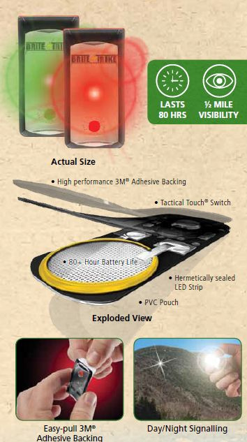 -samolepící signální světlo -ideální řešení pro nouzové osvětlení, označení cesty nebo nouzovou signalizaci ve dne i v noci -velmi jasná LED dioda -2 režimy svícení (blikání /svícení) -účinný zdroj světla nahrazující objemná chemická jednorázová světla -světlo lze ponořit pod vodu a díky hermetickému provedení je odolné proti prachu -určeno pro použití v extrémních podmínkách od horkých pouštních oblastí až po nejchladnější vody oceánů -doba použití až 80 hodin běhu -určeno na jedno použití