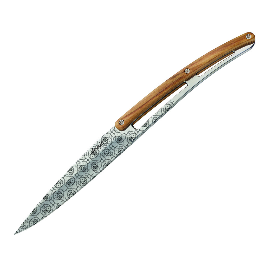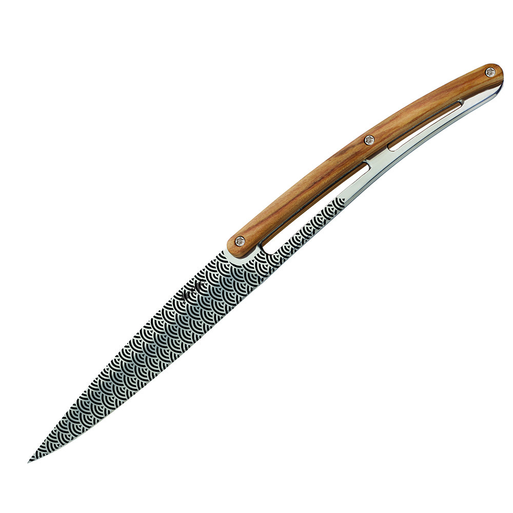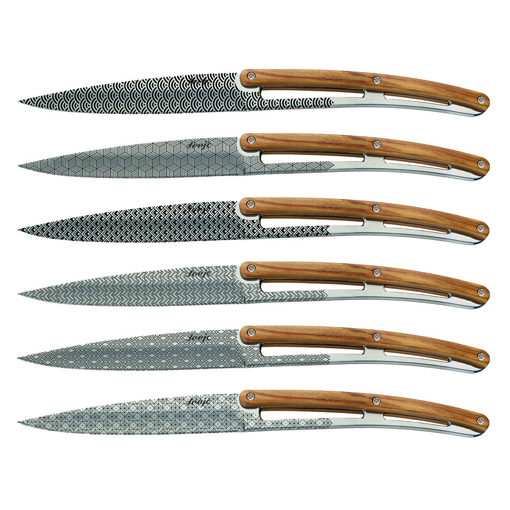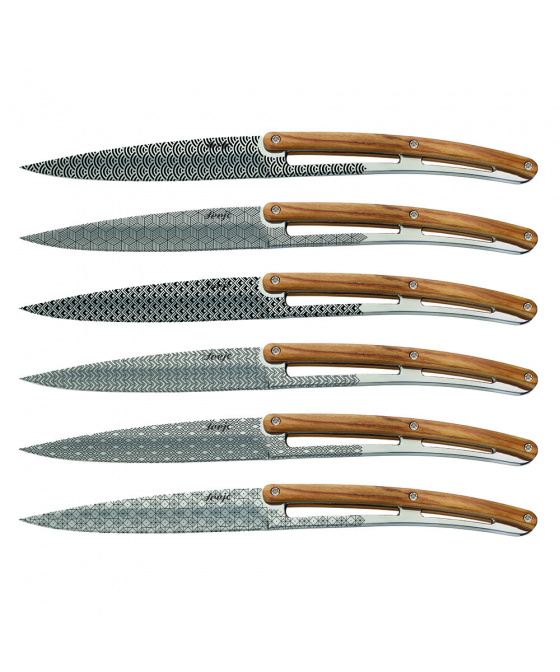 Sada stylových příborových nožů s rukojetí z olivového dřeva a lesklou čepelí opatřenou geometrickými vzory.
