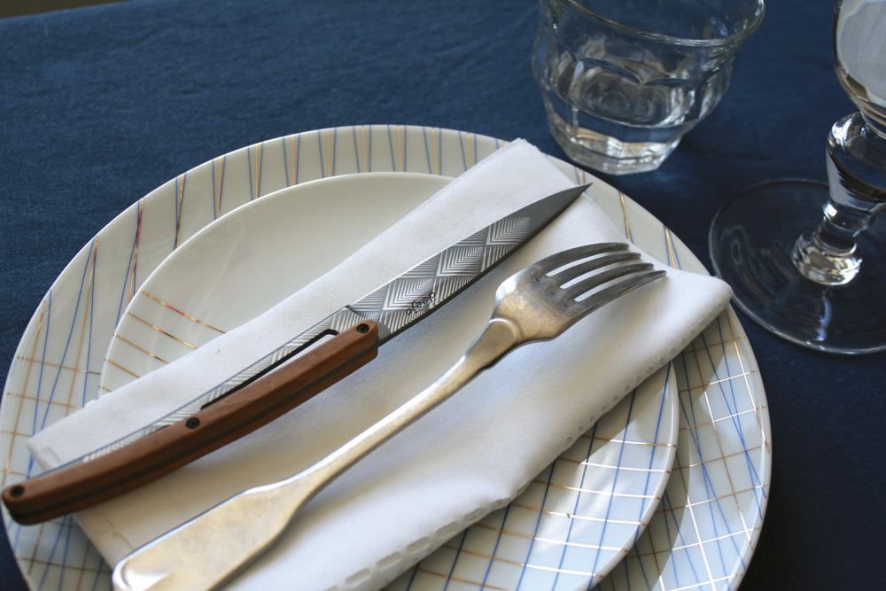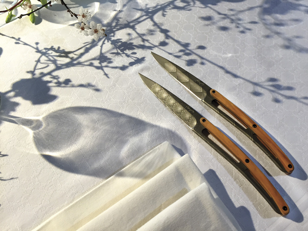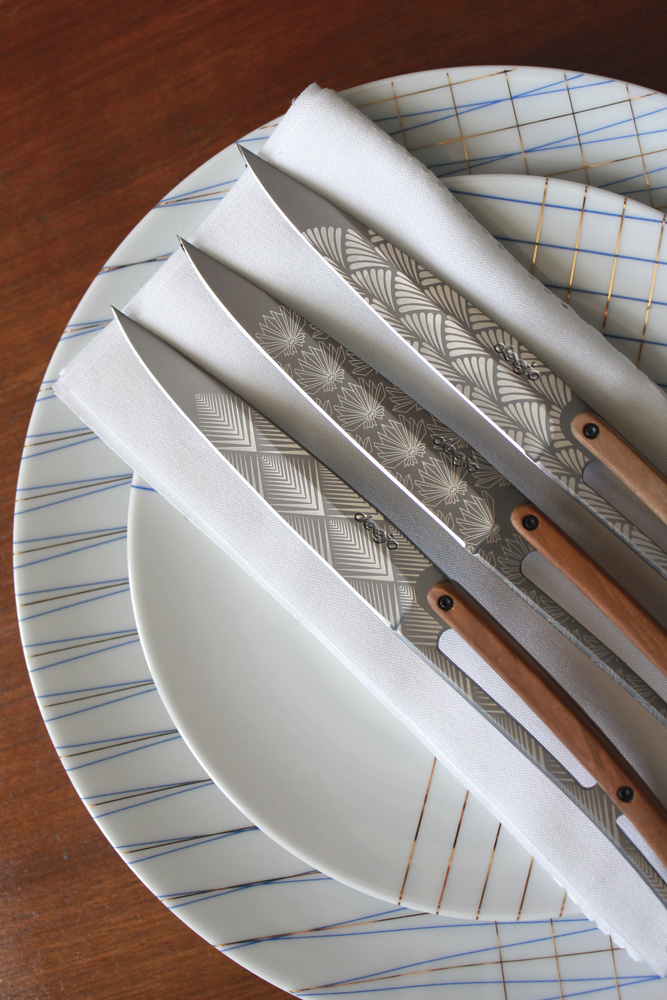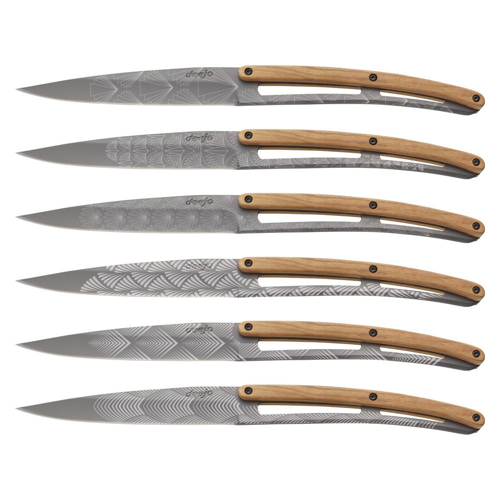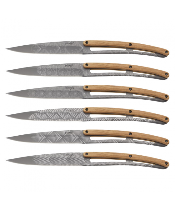 <p>Sada stylových příborových nožů s rukojetí z olivového dřeva a titanově šedou matnou čepelí se vzory ve stylu Art Déco.</p>
