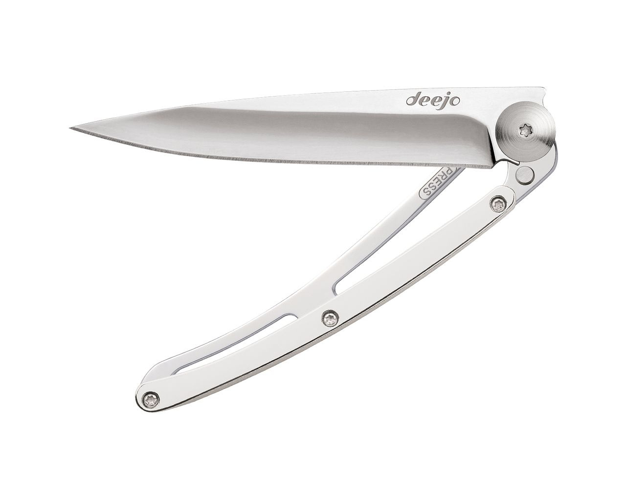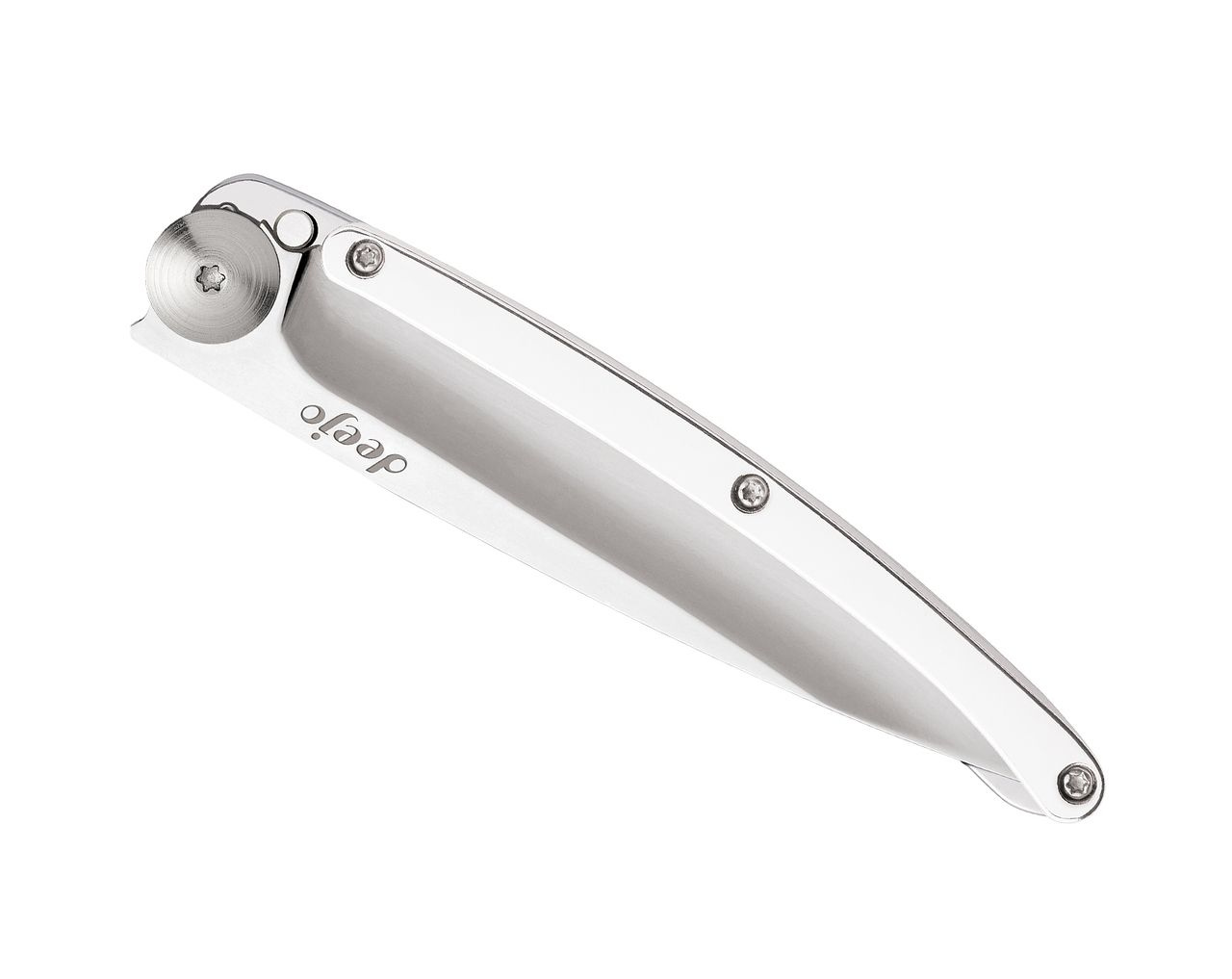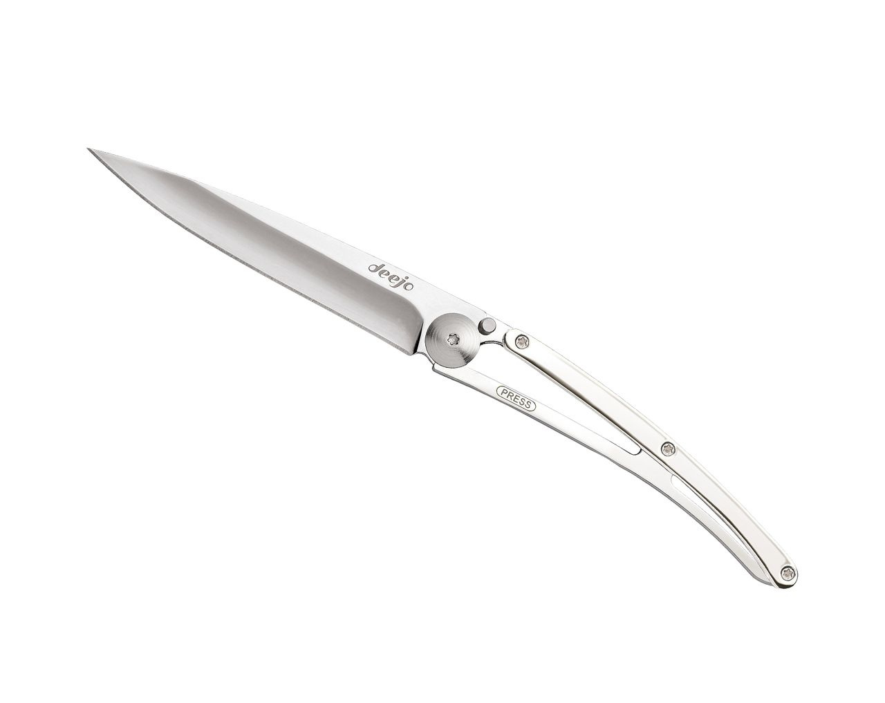 Kapesní nůž Deejo s rukojetí pokovenou 9 kt bílým zlatem a čepelí v zrcadlovém lesku.