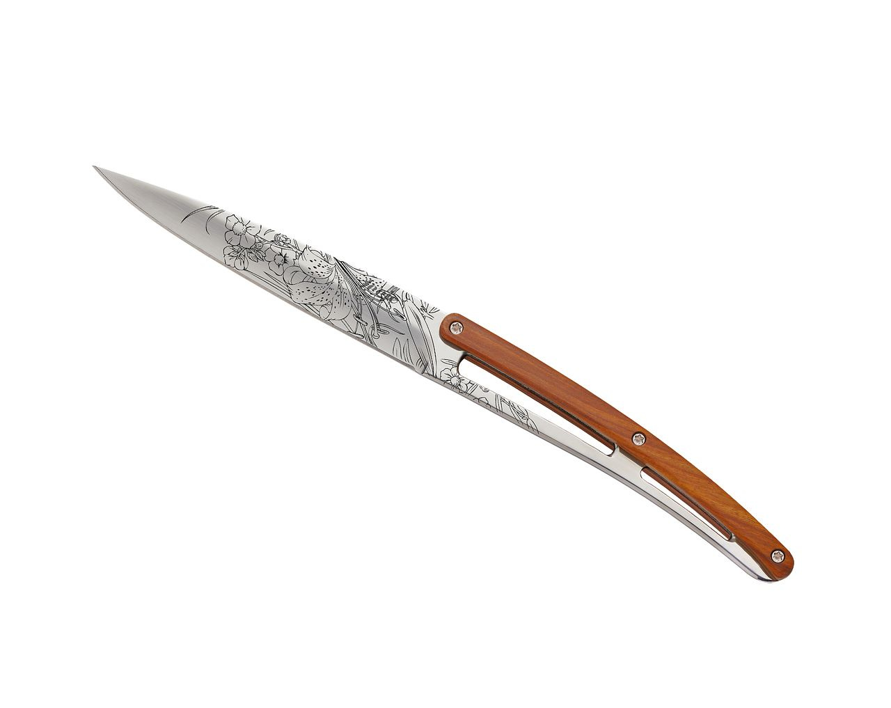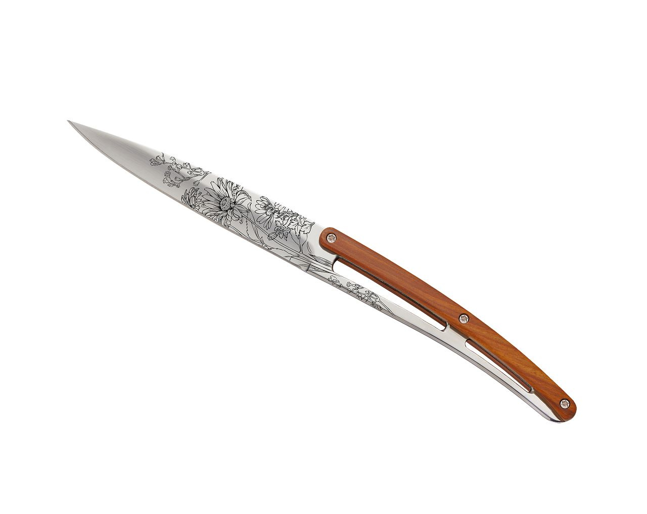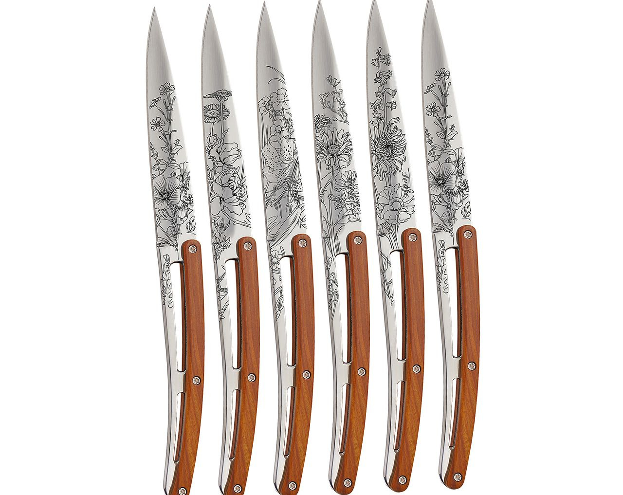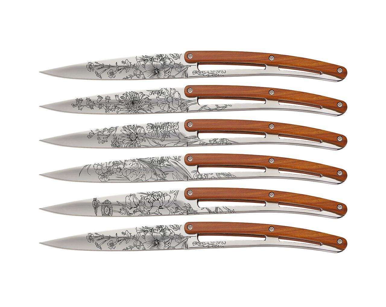 Sada stylových příborových nožů s rukojetí z dřeva coralwood a čepelí opatřenou květinovými vzory.