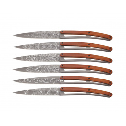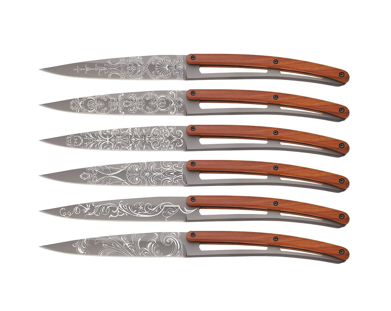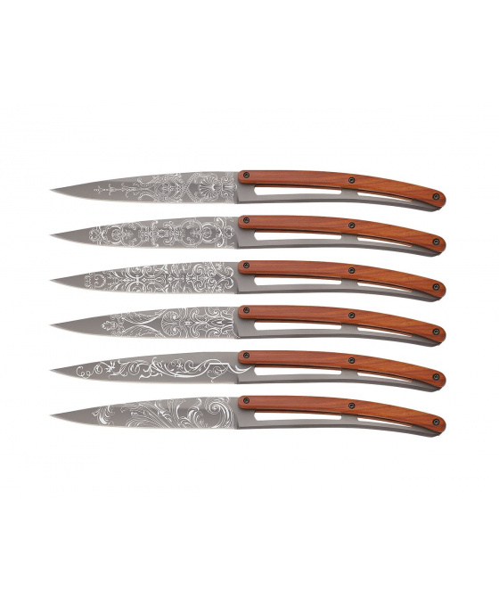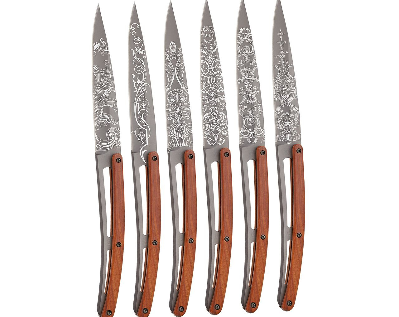 Sada stylových příborových nožů s rukojetí ze dřeva coralwood a světle šedou čepelí opatřenou vzory "Grand Siecle".