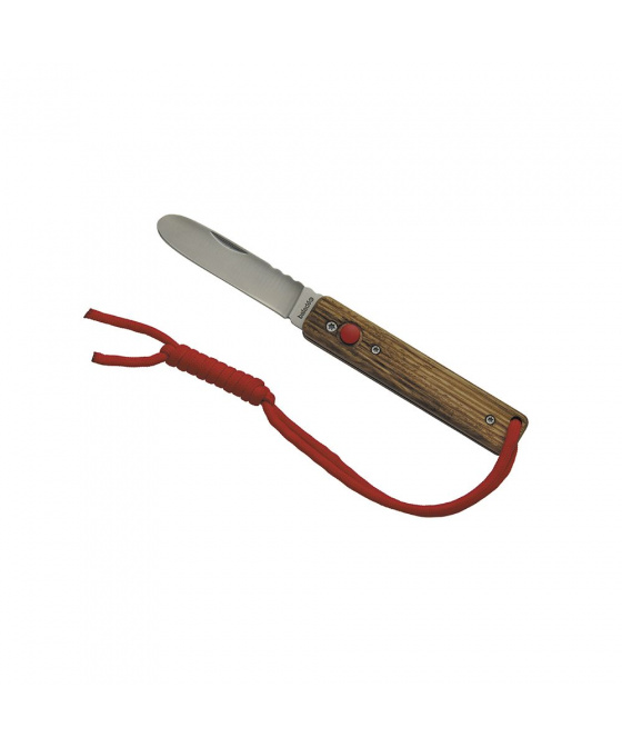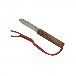 Dětský nůž s dřevěnou rukojetí, šňůrkou a bezpečnostní pojistkou.