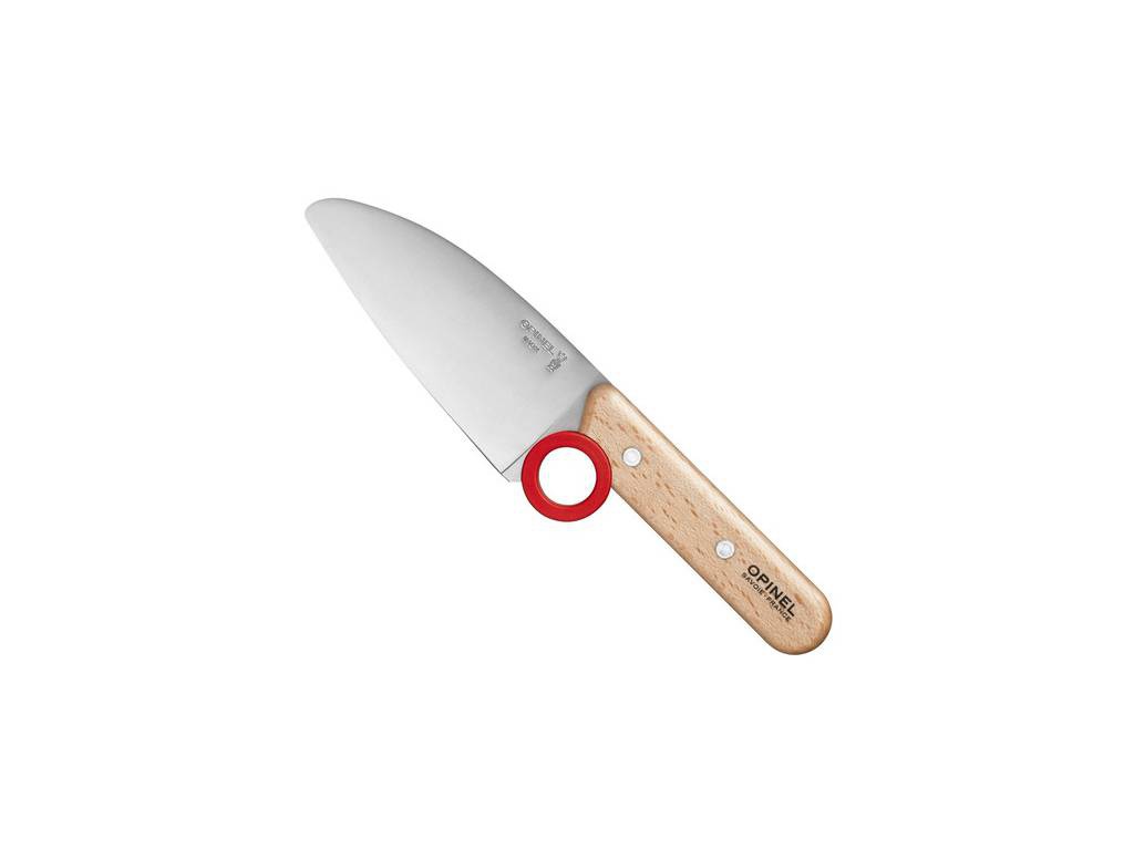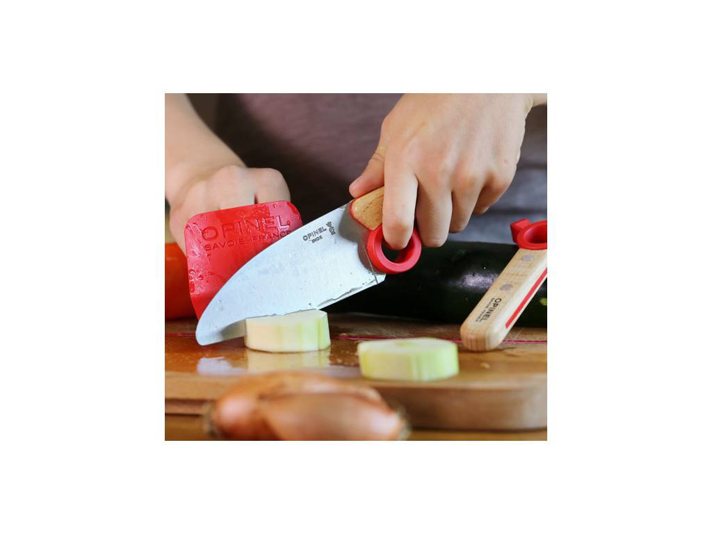 Dětský kuchařský set je praktickou pomůckou, jak naučit malé kuchařské pomocníky správným a bezpečným návykům při používání nožů a škrabek. Nůž i škrabka jsou vybaveny ergonomickým červeným kroužkem, který pomáhá naučit správným způsobům držení a umístění prstů a zvyšuje bezpečnost při jejich používání. Zaoblená špička nože pro vyšší bezpečnost. Čepel nože je však ostrá jako běžné nože Opinel, proto opravdu malé pomocníky nenechávejte bez dozoru.