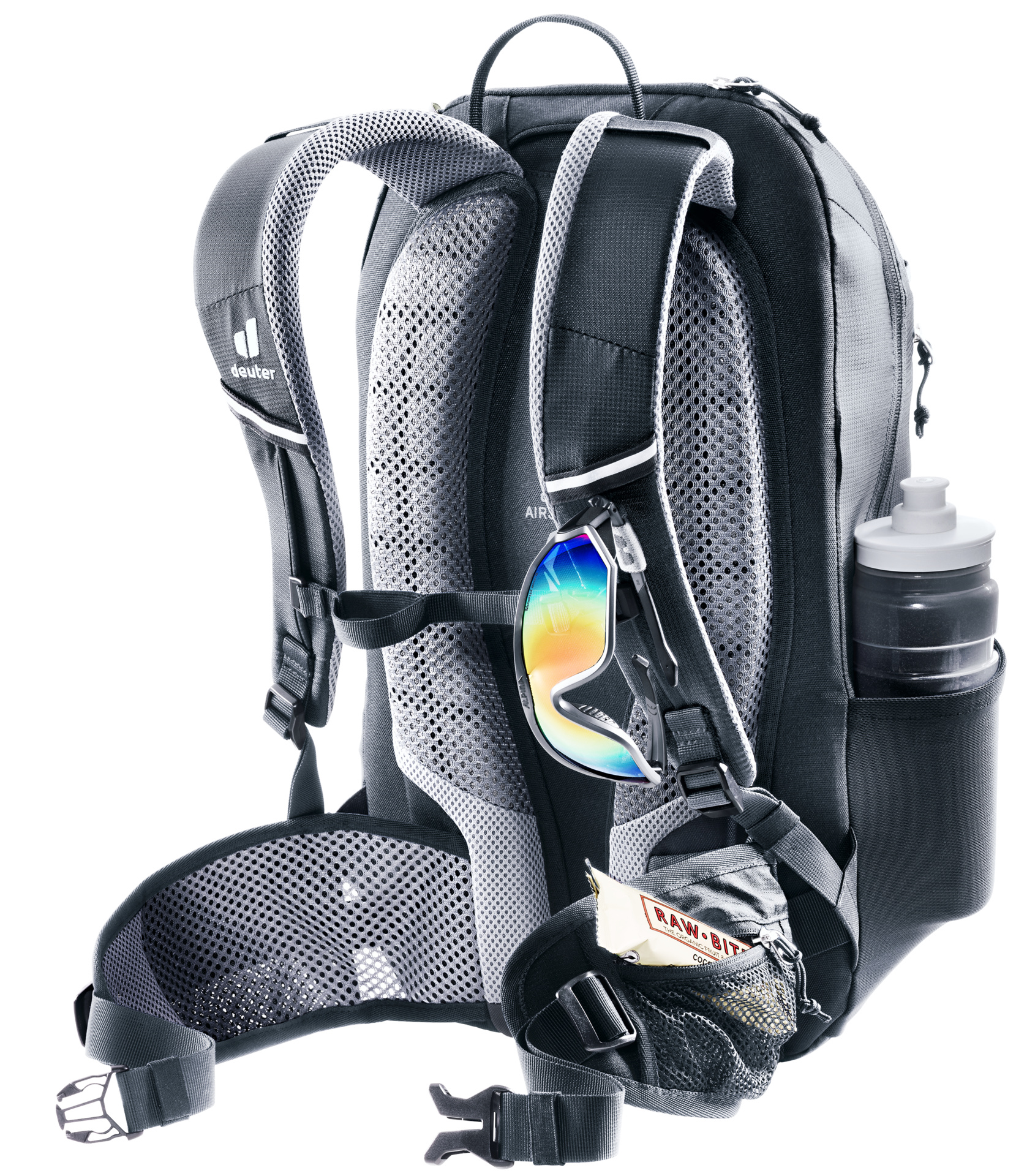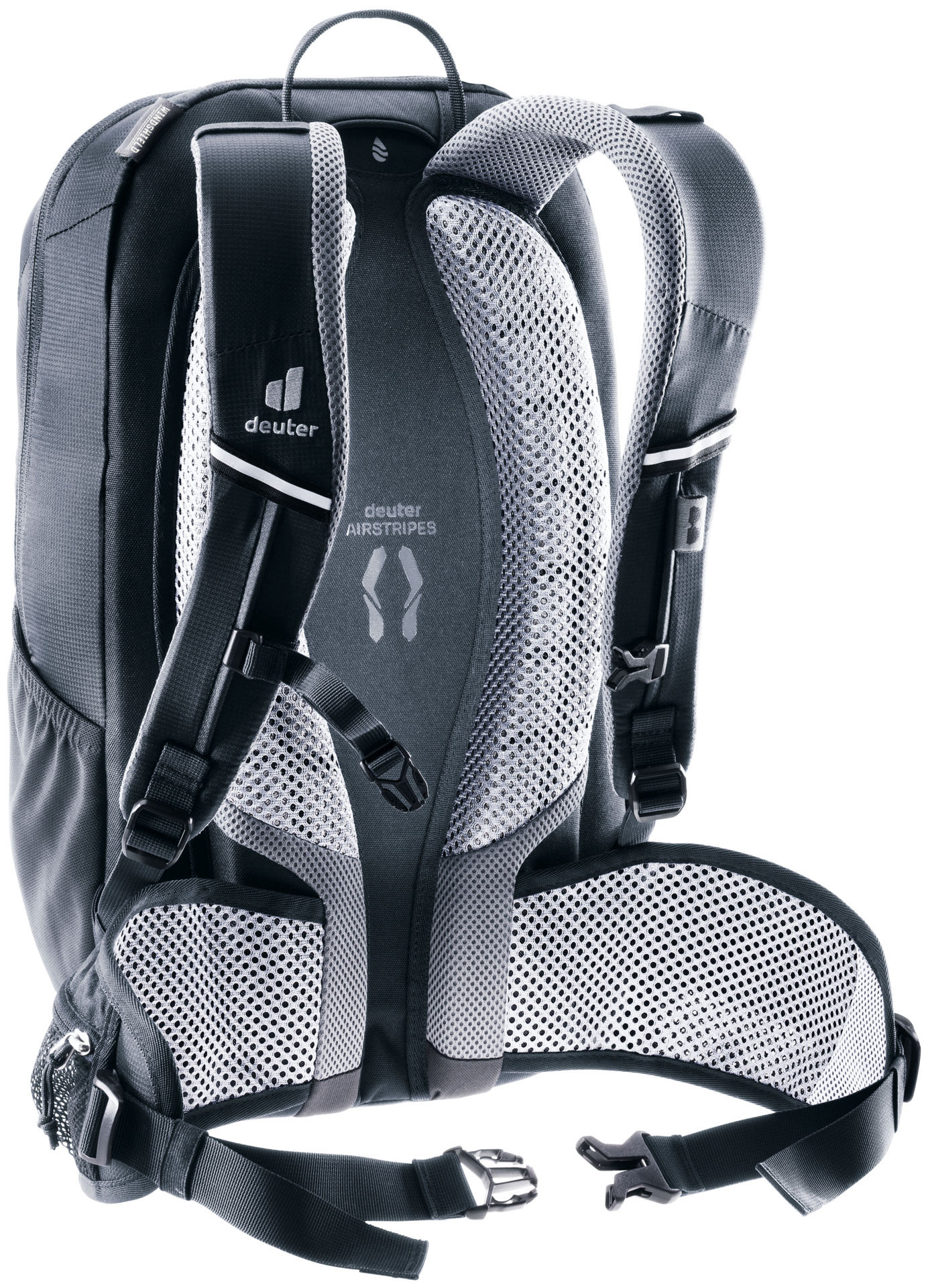 Model využívá zádový systém Airstripes, který poskytuje vynikající ventilaci díky dvěma pásem pěny s mřížkou a minimalizované kontaktní ploše se zády – tím se snižuje pocení při jízdě. Materiály zahrnují recyklovaný 600D polyester a 210D polyamid podle oficiálních specifikací. Batoh má zipový vstup zip-kolem (zip-around), boční strečové kapsy, kapsu na hydrovak, reflexní detaily a integrovanou pláštěnku/neon-kapuci.