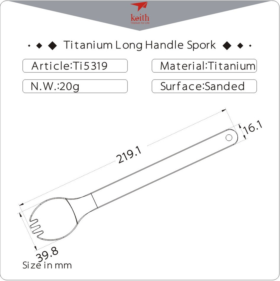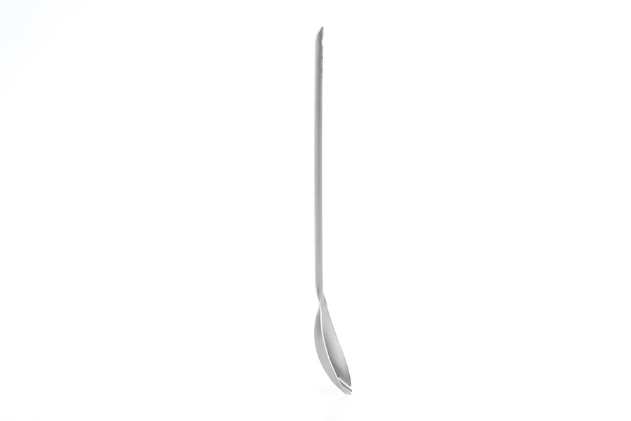Tento "Spork" s prodlouženou rukojetí je vyroben z čistého titanu a prvotřídní povrchové úpravy. Svým tvarem a velikostí je určen především pro turistiku, kempování a cestování a je také ideální pro pikniky, doma, ve škole nebo v kanceláři. Titan je ultra lehký a super silný; je šetrný k životnímu prostředí, biokompatibilní a odolný bakteriím; je také extrémně hypoalergenní a výjimečně odolný vůči korozi.