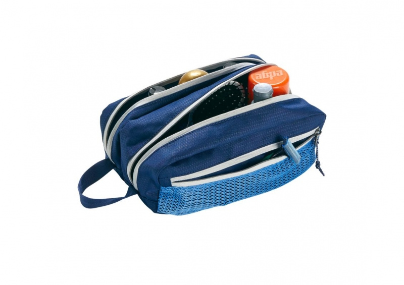 modrošedá toaletní taška 3l z recyklovaného polyesterového mikrovlákna s prodyšnou síťovinou pro lepší přehlednost, třemi kapsami na zip a poutkem pro přenášeníVíce