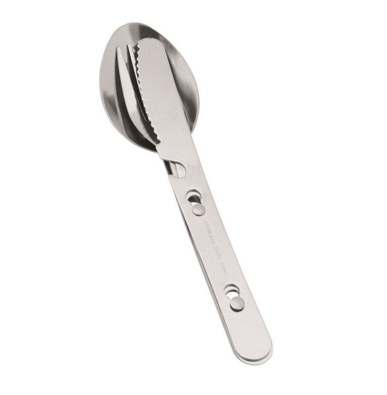 nerezový kempinkový příbor tvořený vidličkou, příborovým nožem a lžící s otvírákem na lahve integrovaným do nože, který lze prakticky spojit dohromadyVíce