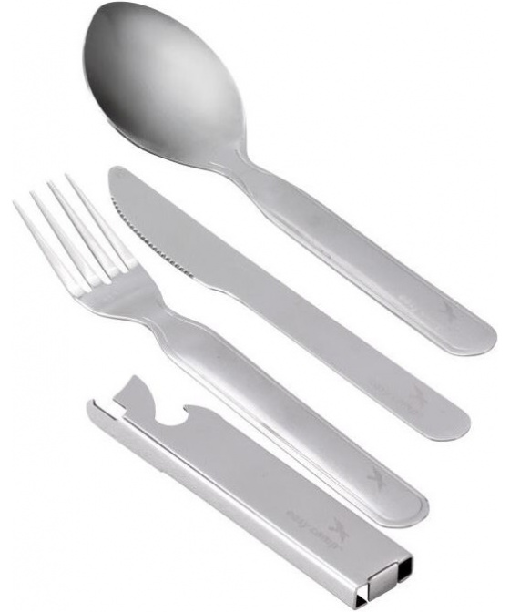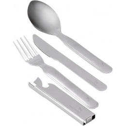 nerezový kempinkový příbor tvořený vidličkou, příborovým nožem a lžící otvírák na lahve integrovaný do příborového nože vidličku a nůž lze jednoduše prakticky spojit s rukojetí lžíceVíce