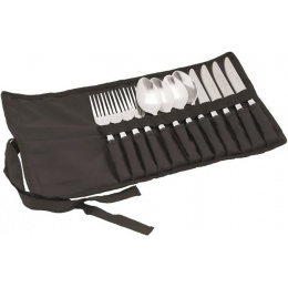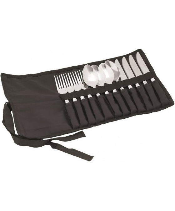 sada nerezových příborů pro čtyři osoby ideální pro rodinné kempování obsahuje čtyři lžíce, čtyři vidličky a čtyři jídelní nože rukojeti z plastu elastická poutka udrží příbory na místě díky rolovacímu úložnému obalu se snadno zabalí a převáží poutko pro přenášení