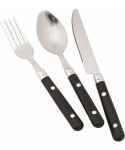 sada nerezových příborů pro čtyři osoby ideální pro rodinné kempování obsahuje čtyři lžíce, čtyři vidličky a čtyři jídelní nože rukojeti z plastu elastická poutka udrží příbory na místě díky rolovacímu úložnému obalu se snadno zabalí a převáží poutko pro přenášeníVíce