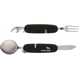 jednoduchý skládací příbor, který lze rozdělit na dvě části lžíce, vidlička, kapesní nůž otvírák na lahve a na konzervy kroužek pro zavěšení baleno v blistru