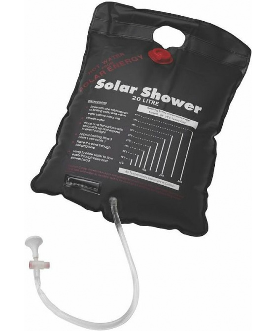 solární sprcha se zásobníkem na 20 l,absorbující sluneční záření a ekologickyzabezpečující ohřev vody teploměr se stupnicí od 33°C do 53°C časy ohřevu uvedené na sprše jsou založeny na předpokladu slunečného dne o teplotě 21°C pohodlná rukojeť s otvorem pro zavěšení háček s provázkem pro další možnost zavěšení nastavitelný sprchový kohoutek kompaktní balení jednoduchá instalace