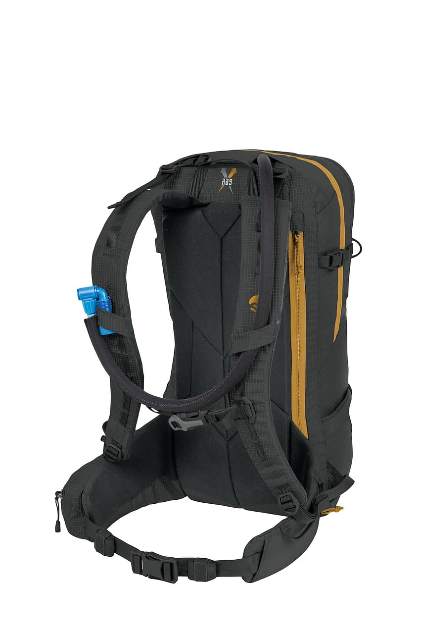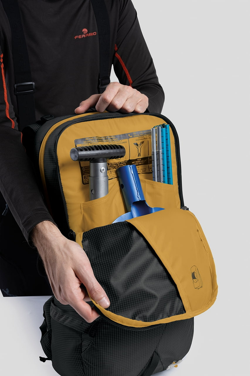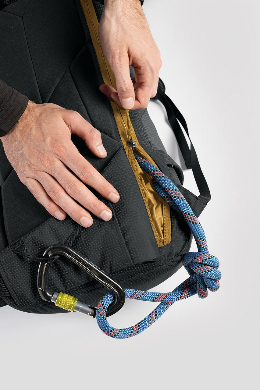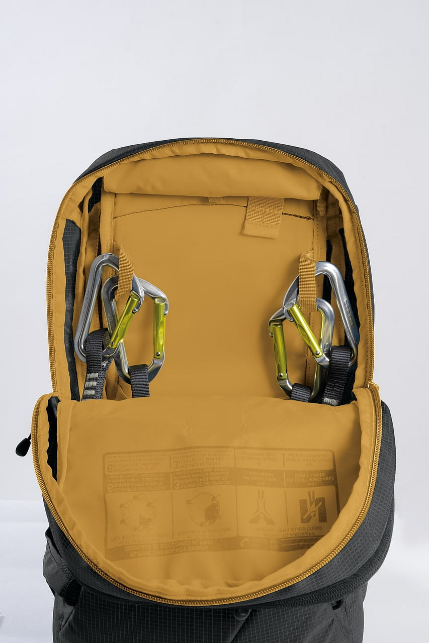 - Technický batoh s důrazem na přehlednou organizaci výbavy, rychlý přístup a stabilní nošení při sjezdu