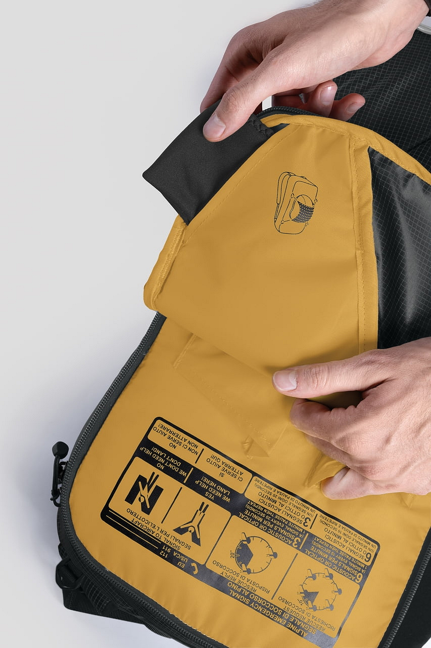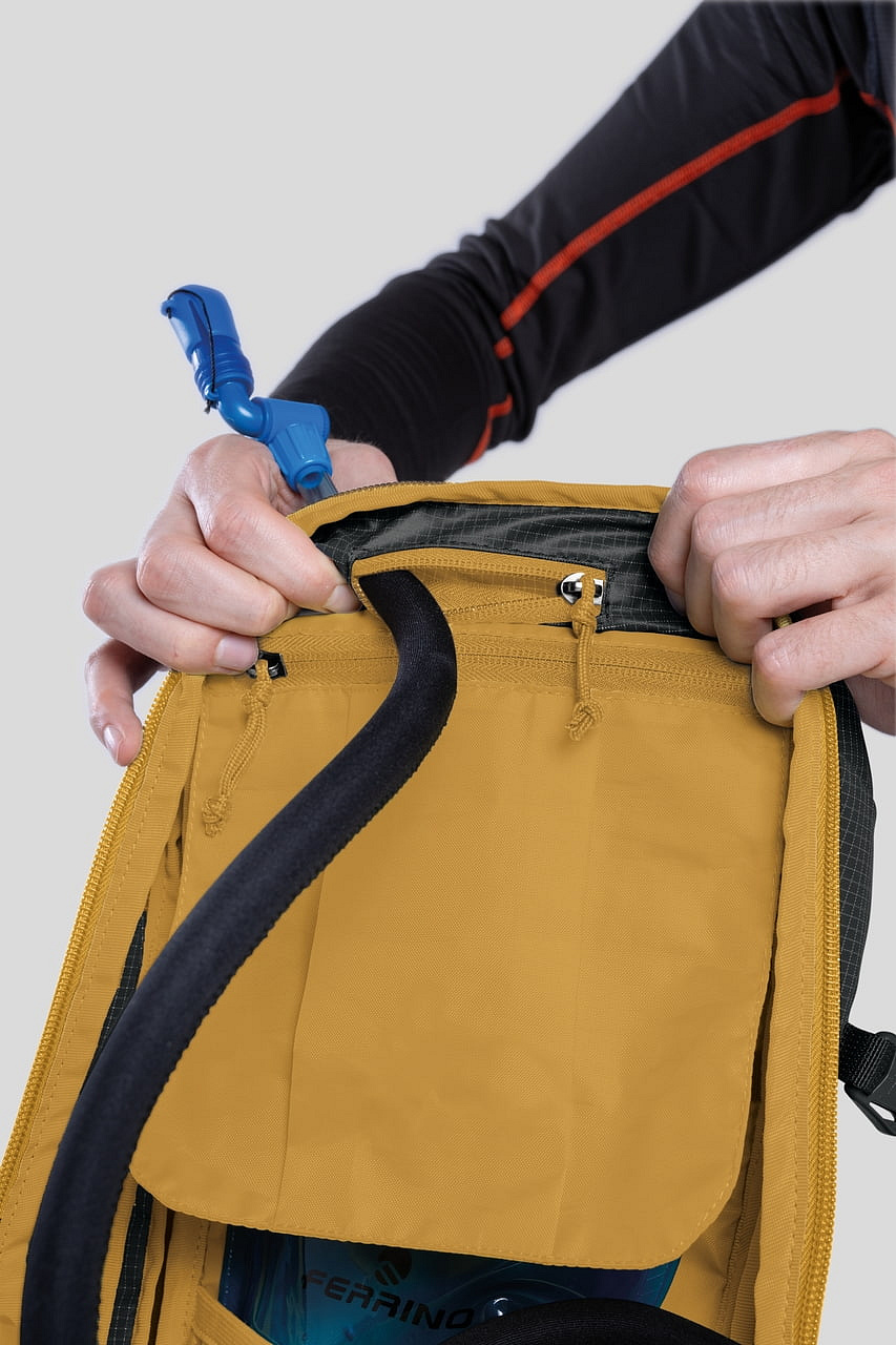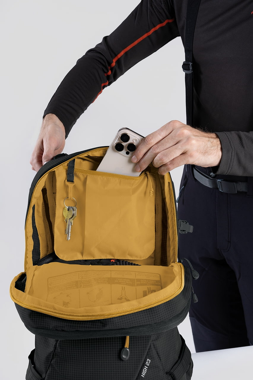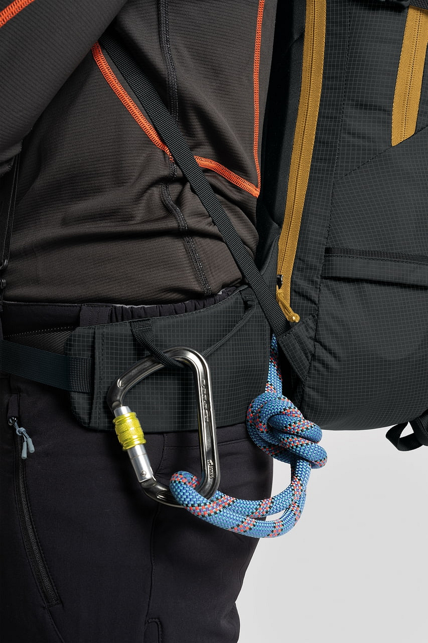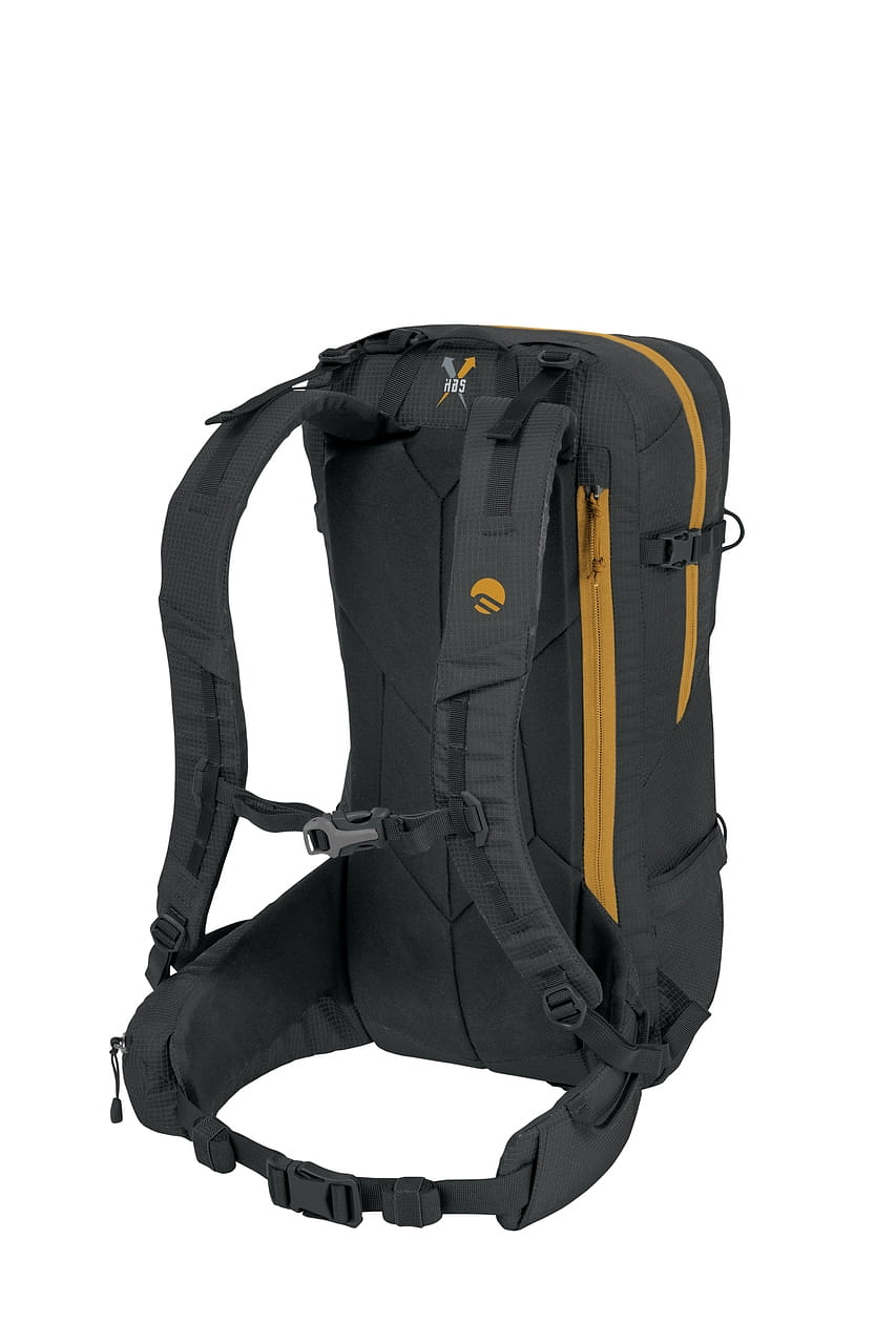 - Technický batoh s důrazem na přehlednou organizaci výbavy, rychlý přístup a stabilní nošení při sjezdu