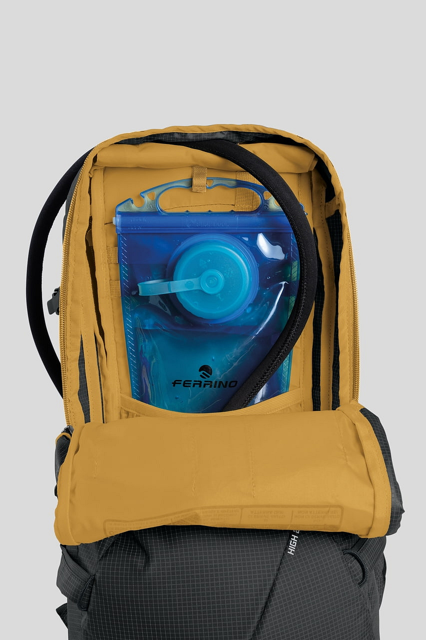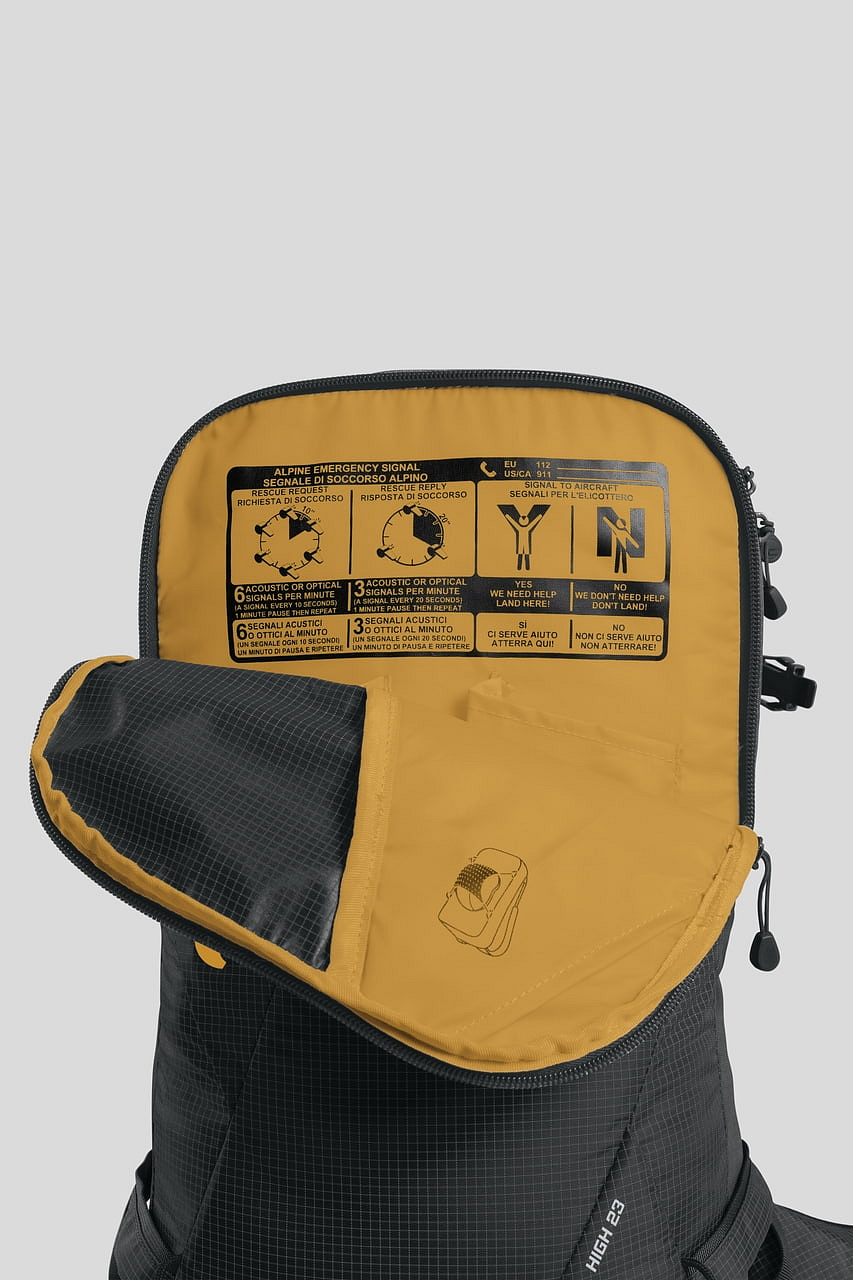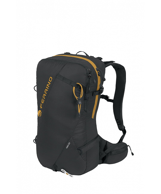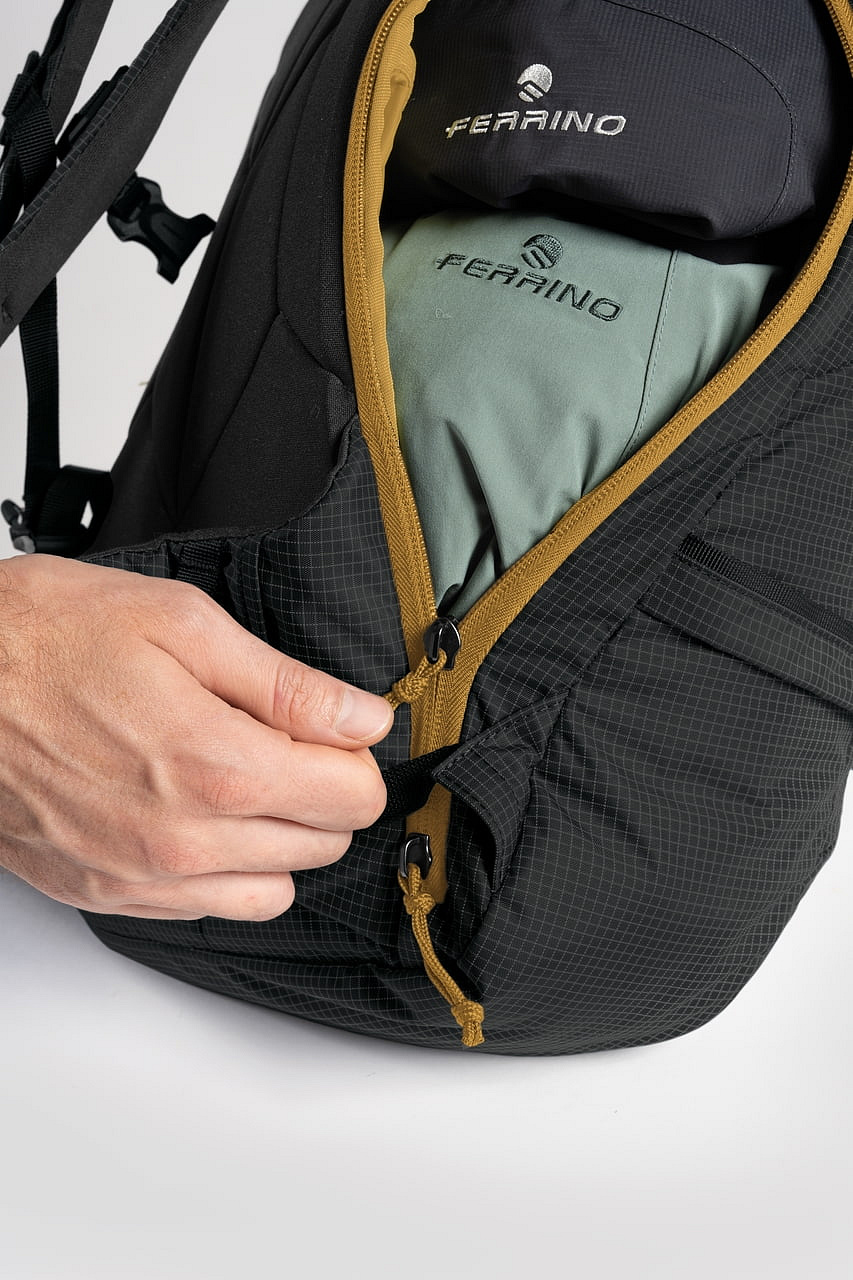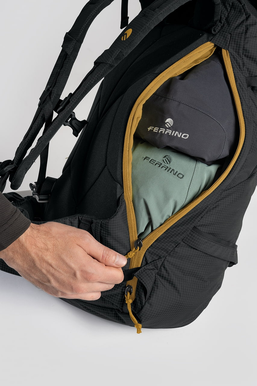 - Technický batoh s důrazem na přehlednou organizaci výbavy, rychlý přístup a stabilní nošení při sjezdu