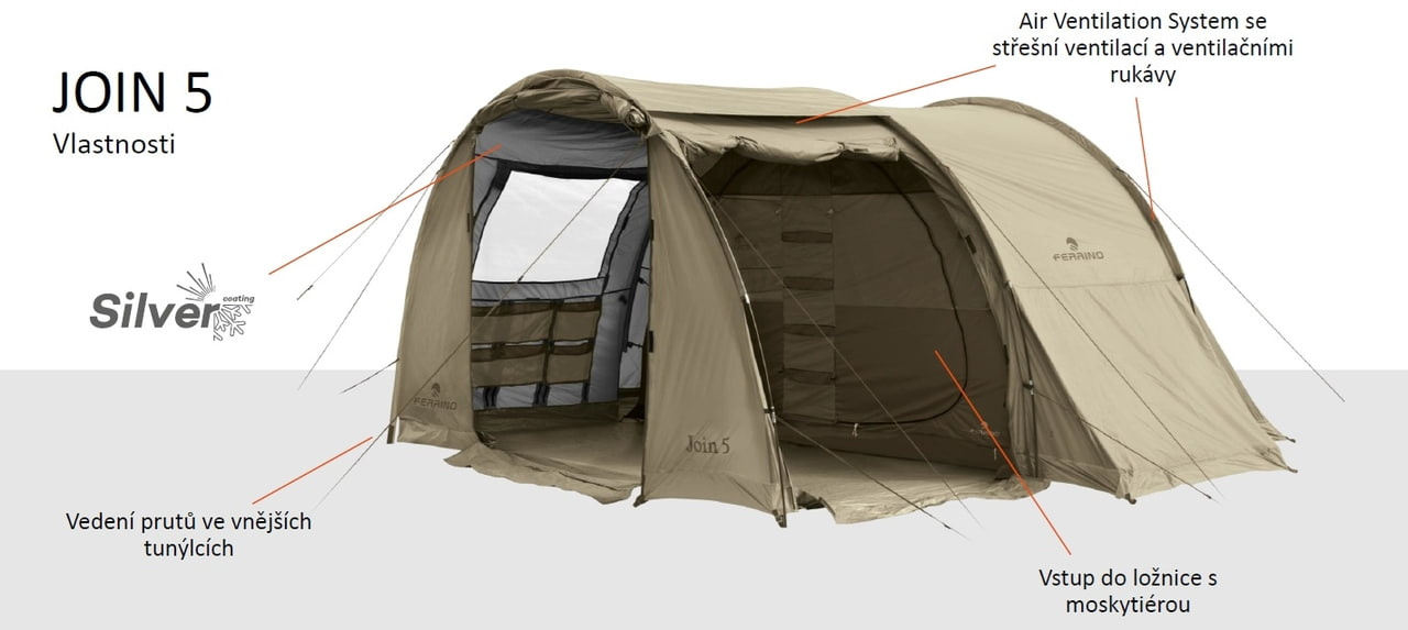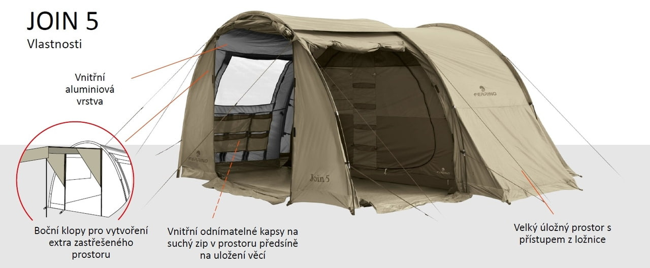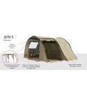 Jsi dobrodruh srdcem i duší, pořídil sis velkou rodinu a hodláš všem ukázat, že stanování může být komfortní a že si společnou dovolenou v kempu pořádně užijete? Pobal svoji krásnou rodinku, čapni náš nový stan Join 5, hoď ho do auta a vyraz za dobrodružstvím! Join 5 Ti nabízí velmi štědrý prostor až pro pět osob, velkou ložnici s možností přepažení, velkou předsíň a navíc ještě apsidu, aby ses mohl při ranní kávě schovat před pražícím sluncem nebo letním deštíkem. A proč si pořídit Join, namísto jakéhokoliv jiného rodinného stanu? Doménou tohoto letního sídla je obrovské množství kapes, které Ti pomůže i v kempu pod stanem udržovat trochu řád a pořádek. Navíc na obou bocích stanu najdeš další prostor, kam bez problému uložíš svá zavazadla. Dostaneš se k nim jak zvenku, tak zevnitř z ložnice a nebudeš zakopávat o sbalené batohy nebo si ubírat prostor v předsíňce. Přemýšlel jsi, proč se stan jmenuje právě Join? Je to jednoduché... Další výhodou je totiž speciální otvor, kterým prostrčíš kabel k přívodu elektriky a připojíš si k síti všechny svoje vymoženosti moderní doby, i když máš zapnutou moskytiéru a tropiko. Stan disponuje velkým množstvím větracích otvorů, horním a bočním oknem s moskytiérou, dvěma vchody do předsíně, a jedním zadním vchodem. Celá vnitřní strana plochy stanu je opatřena PU zátěrem, který odráží teplo ze slunce a zabraňuje nepříjemnému přehřívání vzduchu uvnitř. Sklolaminátová konstrukce zaručuje pevnost a odolnost stanu i při silnějším větru. Zkrátka a dobře: Join 5 doporučujeme všem dobrodružným rodinkám, které se nehodlají smířit s nudnou dovolenou kdesi v penzionu, ale chtějí zažít pořádné vzrůšo při společném spaní pod stanem.Více