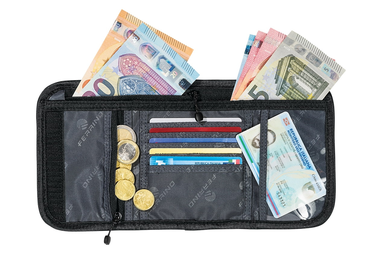 Praktická peněženka na všechny cestovní doklady, platební karty a samozřejmě peníze. Ochrana proti neoprávněnému skenování dat: RFID BLOCKER. Otevírání na suchý zip. Dvojitá přihrádka na bankovky, jedna část s uzavíráním na zip. Kapsa na mince. 5 přihrádek na kreditní karty nebo doklady.Více