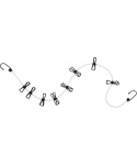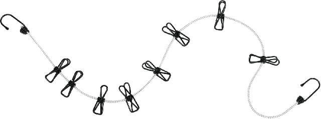 Cestovní elastická šnůra vybavená kovovými háčky a 8 kolíčky na uchycení prádla.