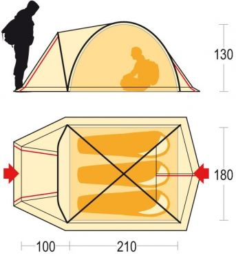 Konstrukce : 3 sklolaminátové tyče – Tvarovaná výztuha předsíňky – Ložnice zavěšena na konstrukci pomocí háčků pro snadnou stavbu a příčnými tunýlky ( Teneré 4 ) – Ocelové kotvící kolíky