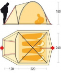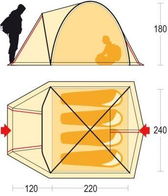 Konstrukce : 3 sklolaminátové tyče – Tvarovaná výztuha předsíňky – Ložnice zavěšena na konstrukci pomocí háčků pro snadnou stavbu a příčnými tunýlky ( Teneré 4 ) – Ocelové kotvící kolíky