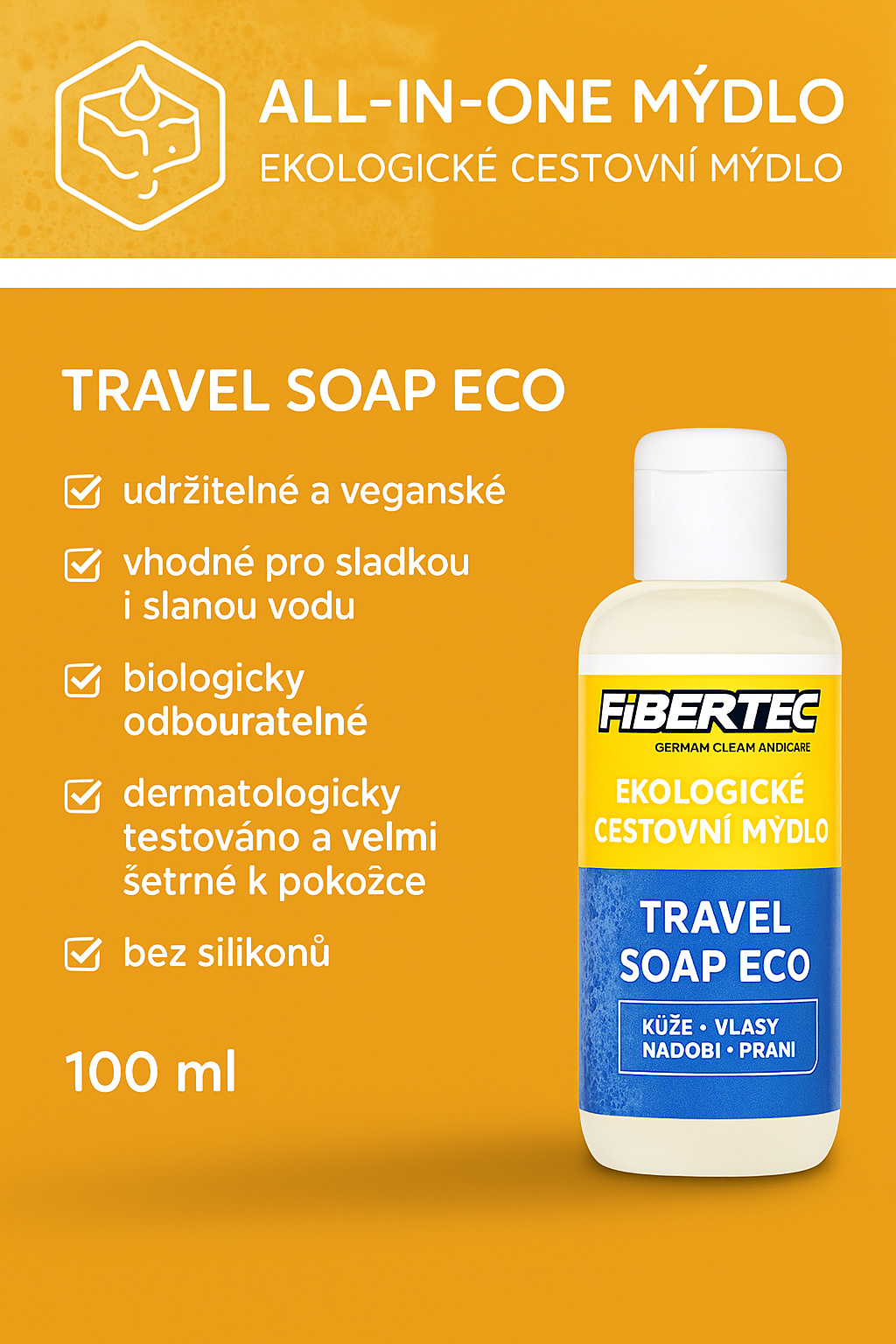 Fibertec Travel Soap Eco je kompaktní a vysoce koncentrované outdoorové mýdlo, které zastoupí hned několik produktů v jednom – šampon, sprchový gel, mýdlo, prostředek na mytí nádobí i prací prostředek. Díky svému šetrnému složení a pH hodnotě 5,5 je ideální pro každodenní péči o tělo a vlasy, a zároveň dostatečně účinné pro použití v přírodě.