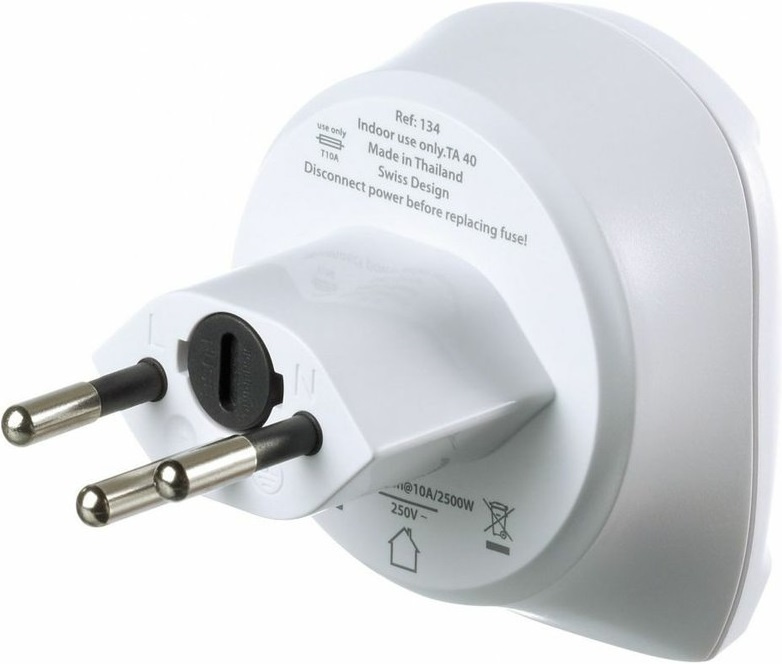 uzemněný adaptér pro cestující z Evropy do Švýcarska určeno pouze pro evropské 2pólové zástrčky Shuko a 3pólové uzemněné švýcarské zásuvky vhodné pro použití s malými elektrickými zařízeními elegantní, kompaktní a lehké bezpečné a snadné použití voltáž 100-240V (max 10A) adaptér nepřevádí napětí možné použít v částech Jordánska, Lichtenštejnsku, Madagaskaru, Maledivách a RwanděVíce