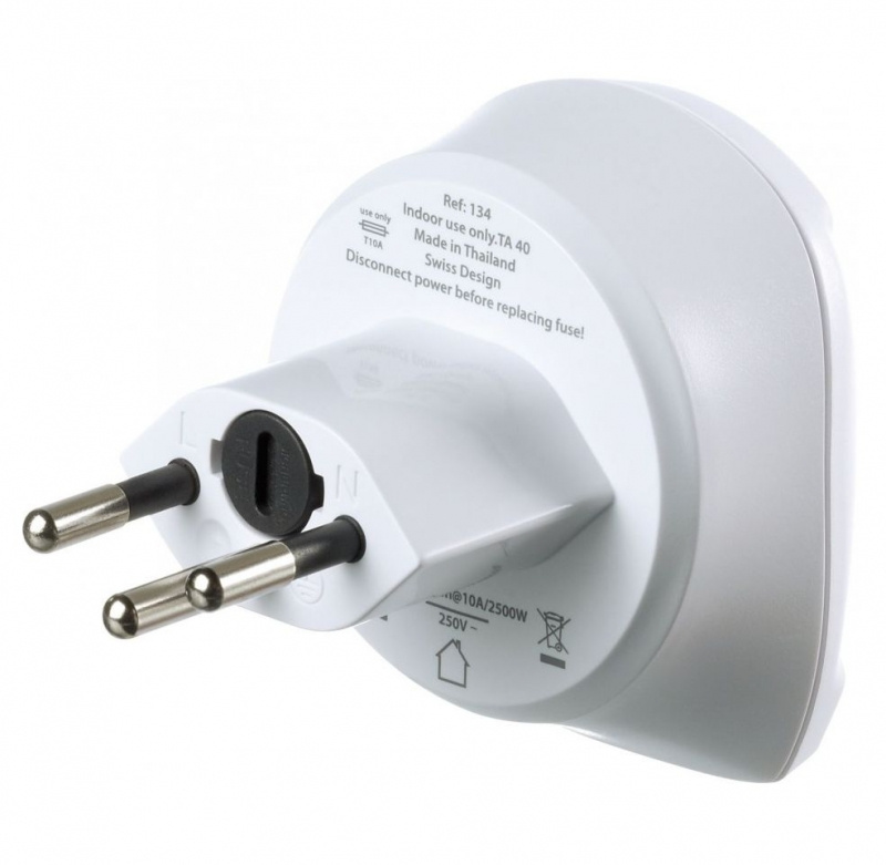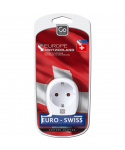 -uzemněný adaptér pro cestující z Evropy do Švýcarska -určeno pouze pro evropské 2pólové zástrčky Shuko a 3pólové uzemněné švýcarské zásuvky -vhodné pro použití s malými elektrickými zařízeními -elegantní, kompaktní a lehké -bezpečné a snadné použití -voltáž 100-240V (max 10A) -adaptér nepřevádí napětí -možné použít v částech Jordánska, Lichtenštejnsku, Madagaskaru, Maledivách a Rwandě