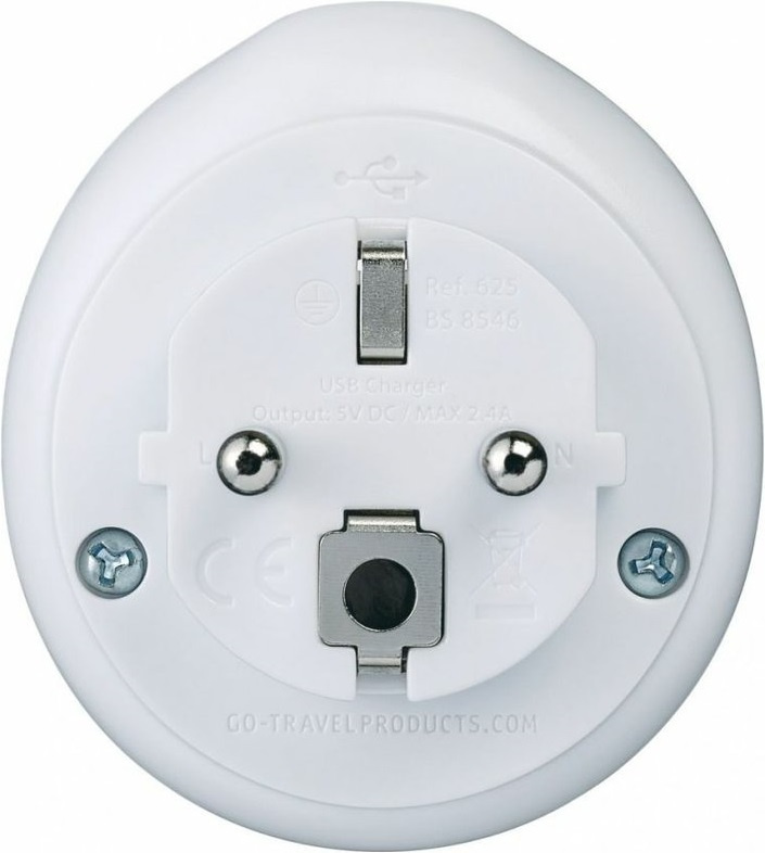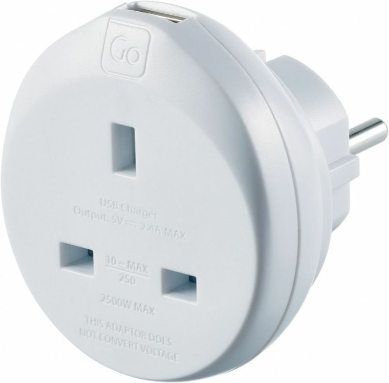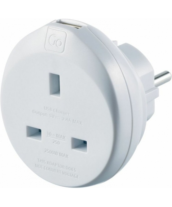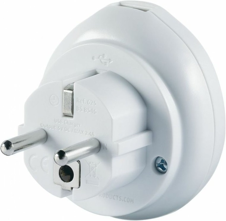 uzemněný adaptér pro cestující z Velké Británie do Evropy určeno pro použití s malými elektrickými zařízeními výrobek je v souladu s bezpečnostními směrnicemi EU a odpovídá směrnicím EU o odpadních elektrických a elektronických zařízeních kompaktní a lehký design, bezpečné a snadné použití převádí britské 3pólové uzemněné zástrčky třídy I, aby vyhovovaly většině evropských zásuvek USB port na horní straně adaptéru specifikace 250V-2500W (max 10A) specifikace USB 5V DC/2,4A max adaptér nepřevádí napětí Pro použití v těchto zemích: Afghanistán, Albánie, Alžírsko, Americká Samoa, Andorra, Arménie, Aruba, Azerbajdžán, Belgie, Bělorusko, Benin, Bhútán, Bosna a Herzegovina, Bulharsko, Burkina Faso, Burundi, Čad, Česká republika, Dánsko, Demokratická republika Kongo, Džibuti, Egypt, Estonsko, Etiopie, Faerské ostrovy, Finsko, Francie, Francouzská Guiana, Grónsko, Gruzie, Guadaloupe, Guinea, Chorvatsko, Indonésie, Irán, Island, Itálie,Jižní Korea, Jordánsko, Kamerun, Kapverdy, Kazachstán, Komory, Kongo, Kyrgyzstán, Laos, Lotyšsko, Libérie, Libye, Litva, Lucembursko, Macau, Maďarsko, Makedonie, Mali, Maroko, Martinik, Moldavsko, Monako, Mongolsko, Montenegro, Mozambik, Myanmar, Německo, Niger, Nizozemí, Nizozemské Antily, Norsko, Nová Kaledonie, Pobřeží slonoviny, Polsko, Portugalsko, Rakousko, Reunion, Rovníková Guinea, Rumunsko, Rusko, Řecko, Senegal, Severní Korea, Slovensko, Slovinsko, Srbsko, Středoafrická republika, Surinam, Svatý Martin, Svatý Tomáš a Princův ostrov, Sýrie, Španělsko, Švédsko, Tadžikistán, Thajsko, Tunisko, Turecko, Turkmenistán, Ukrajina, Uruguay, Vietnam, Východní Timor (některé země mohou mít více než jeden typ zásuvky)