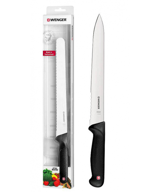 černý porcovací nůž s tuhou částečně ozubenou čepelí o délce 25 cm a ergonomicky tvarovanou střenkou z odolného polyamidu v dárkovém balení z produkce švýcarské značky Wenger